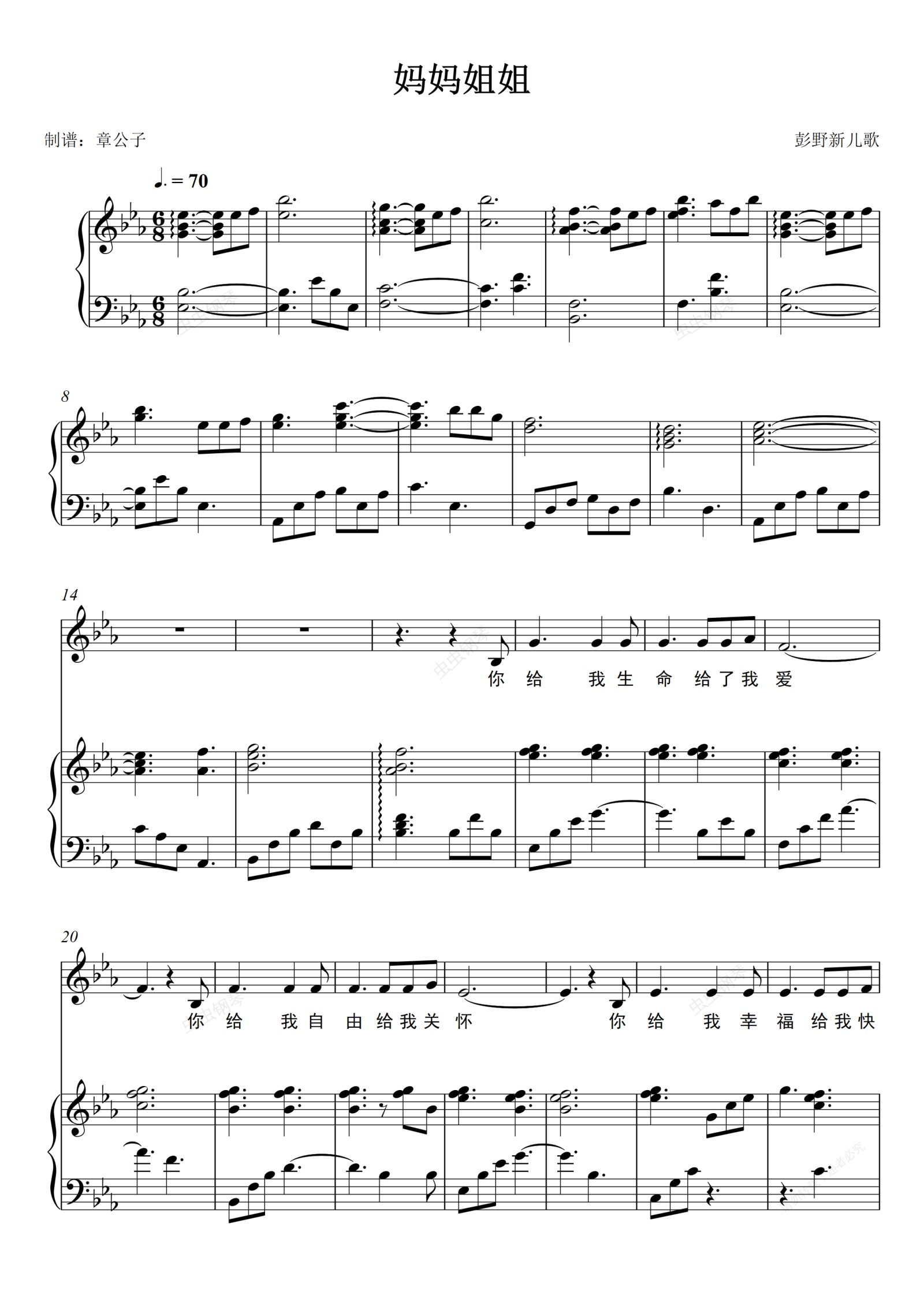 钢琴谱:《妈妈姐姐》 (女童版) 弹唱(伴奏)谱 bE调