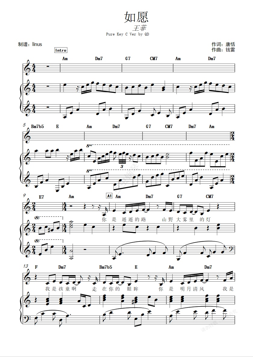 钢琴谱:【如愿 - 王菲 (我和我的父辈 主题曲)】纯净C调+歌词+和弦谱