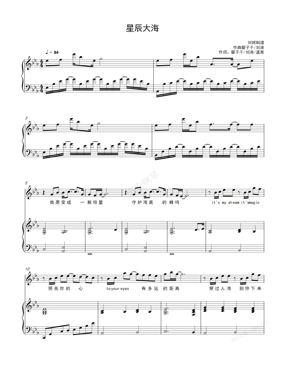 钢琴谱:星辰大海 - 黄霄云 钢琴伴奏版bE调