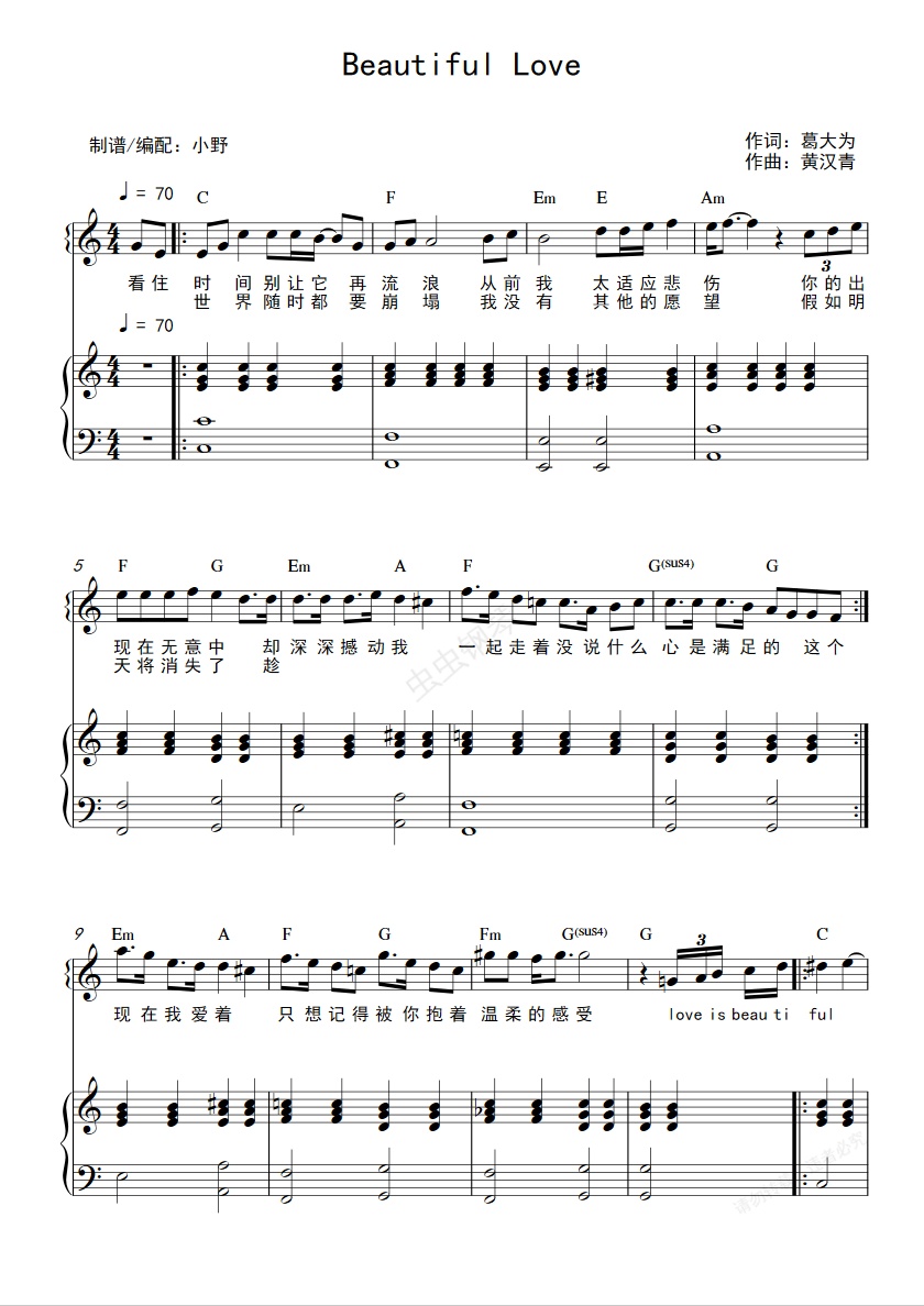钢琴谱:Beautiful Love(和弦弹唱版)