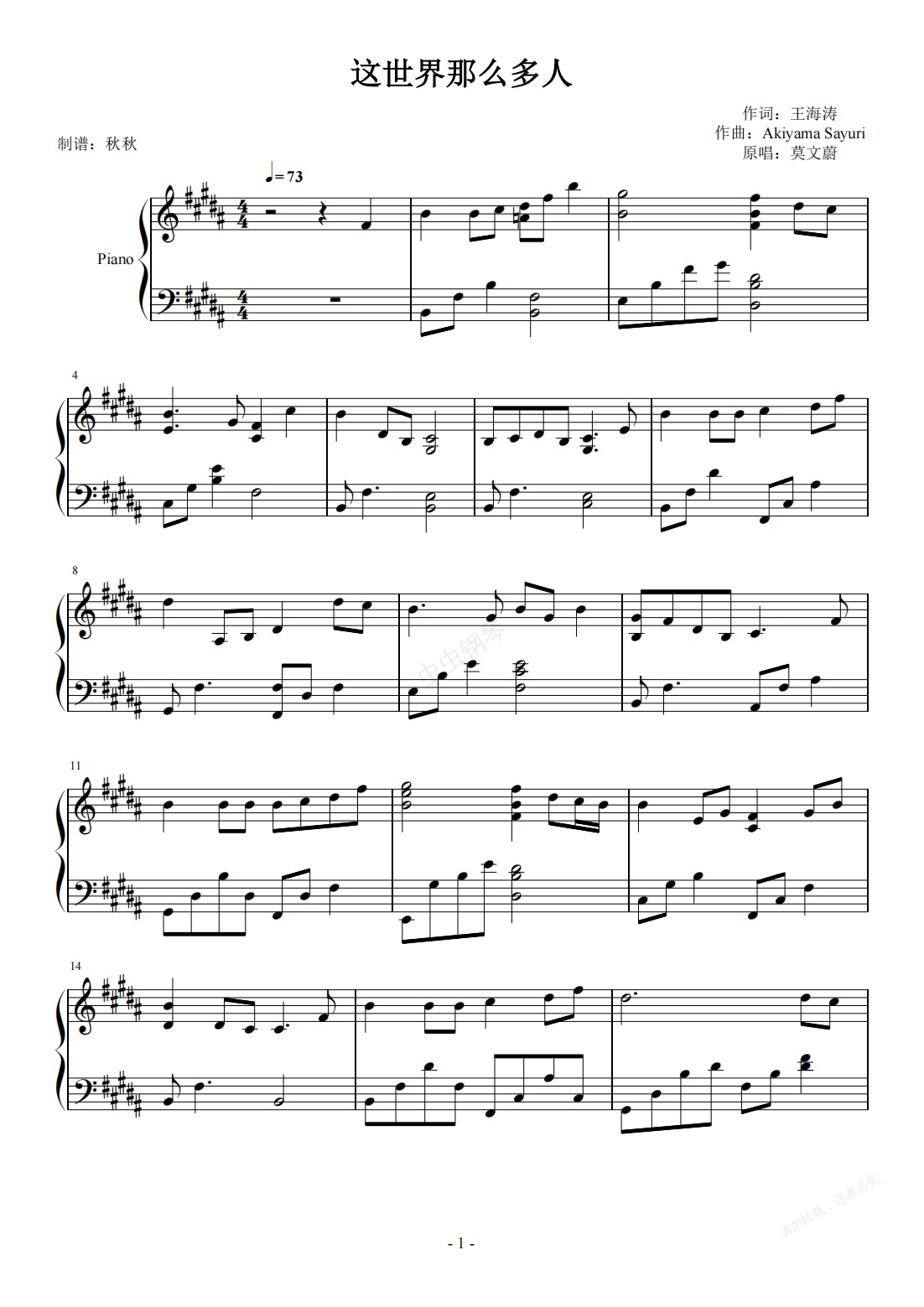 钢琴谱:这世界那么多人-莫文蔚原调B调