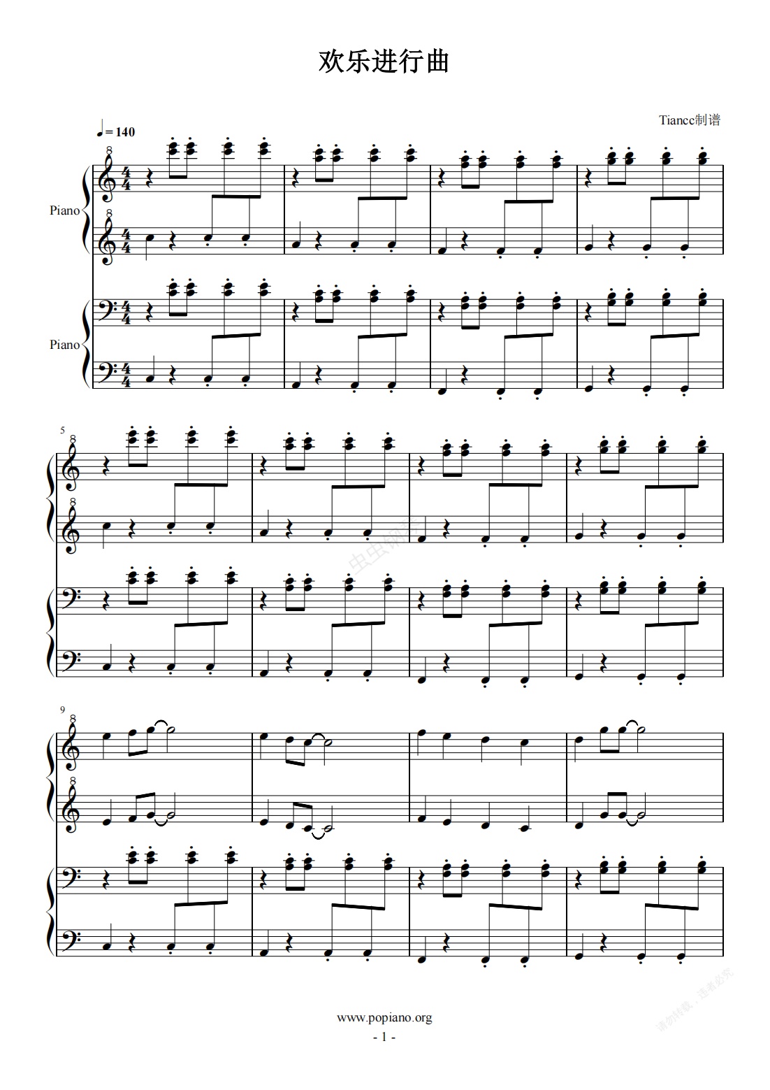 钢琴谱:《欢乐进行曲》四手联弹,琴行经典,拜厄难度