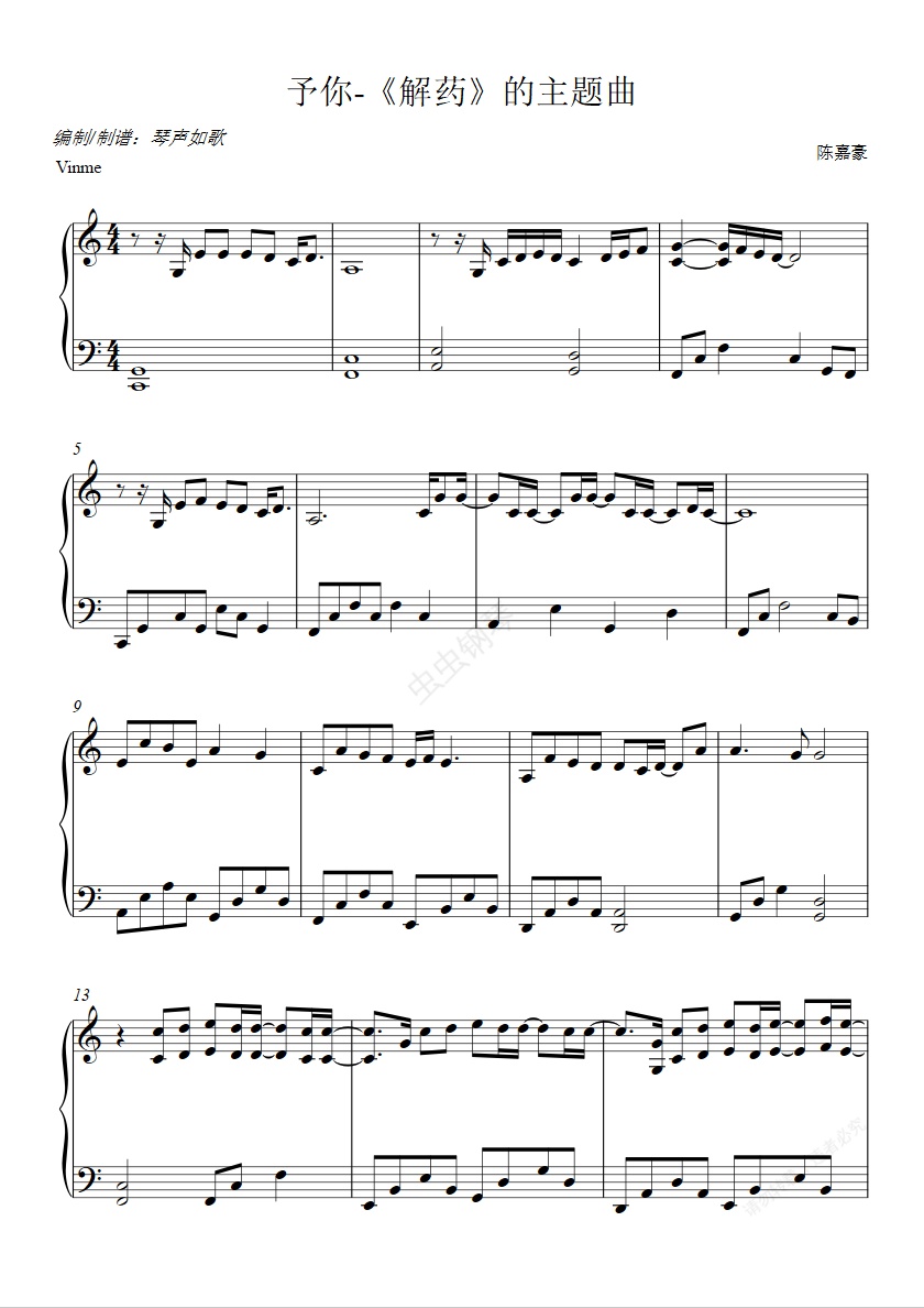 钢琴谱:予你-《解药》的主题曲-好听易演奏版