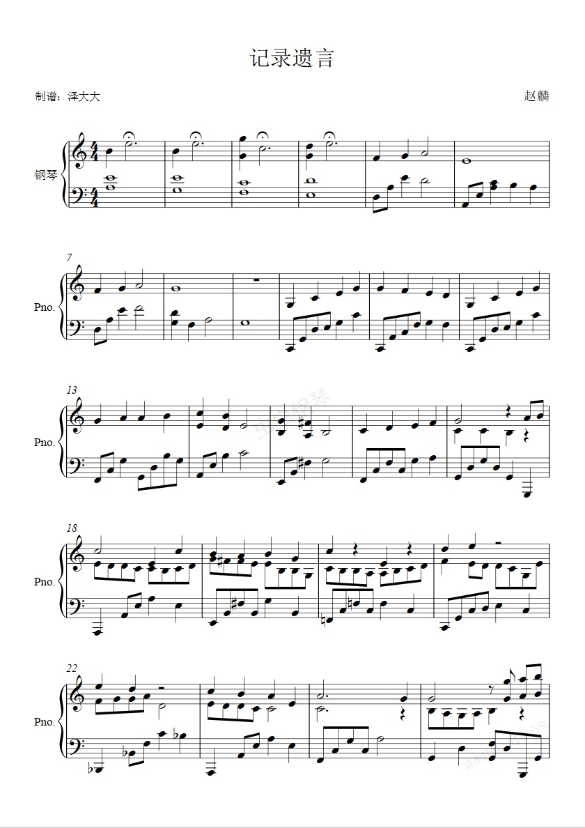 钢琴谱:记录遗言【纯音乐钢琴独奏】泽大大