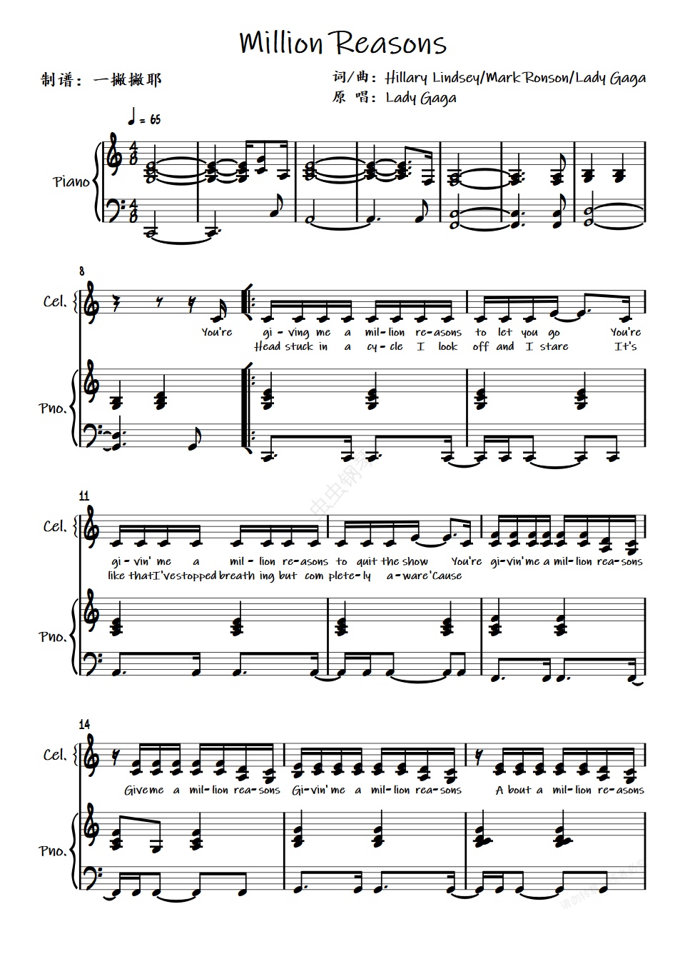 钢琴谱:【弹唱谱】Million Reasons-Lady Gaga「一撇撇耶」