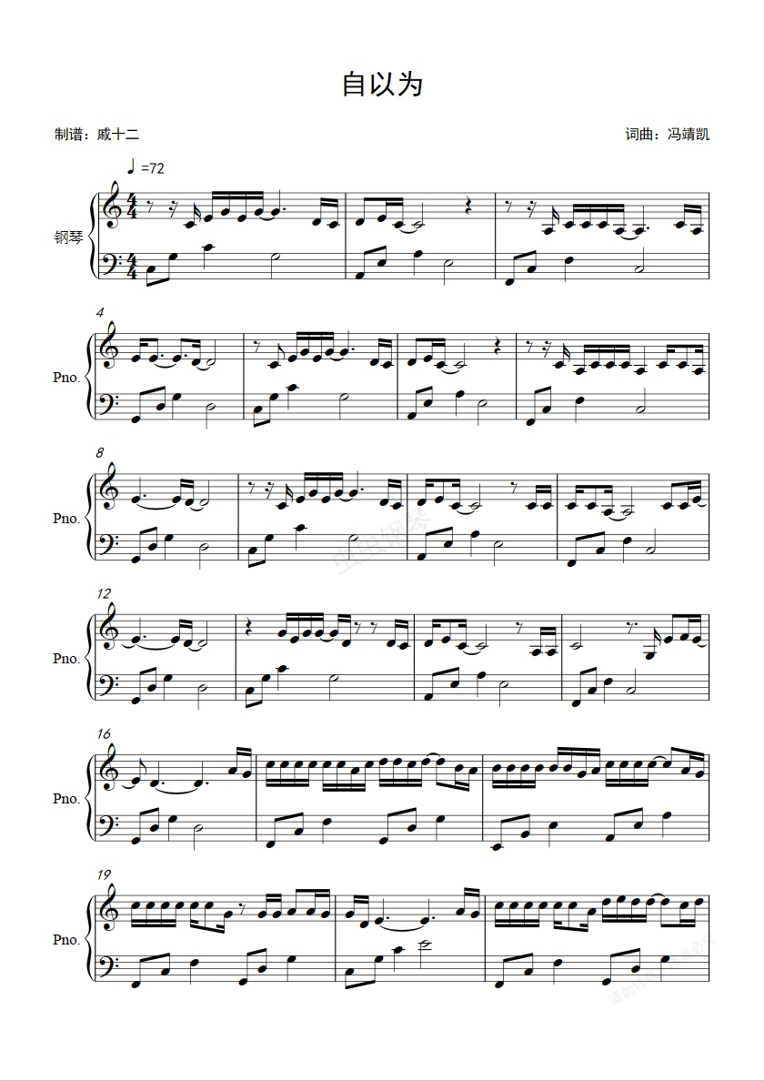 钢琴谱:自以为-C调简单版