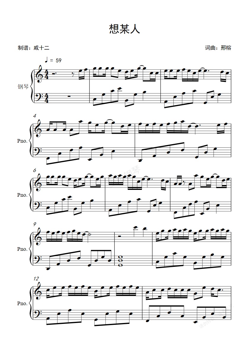 钢琴谱:想某人-C调简单版