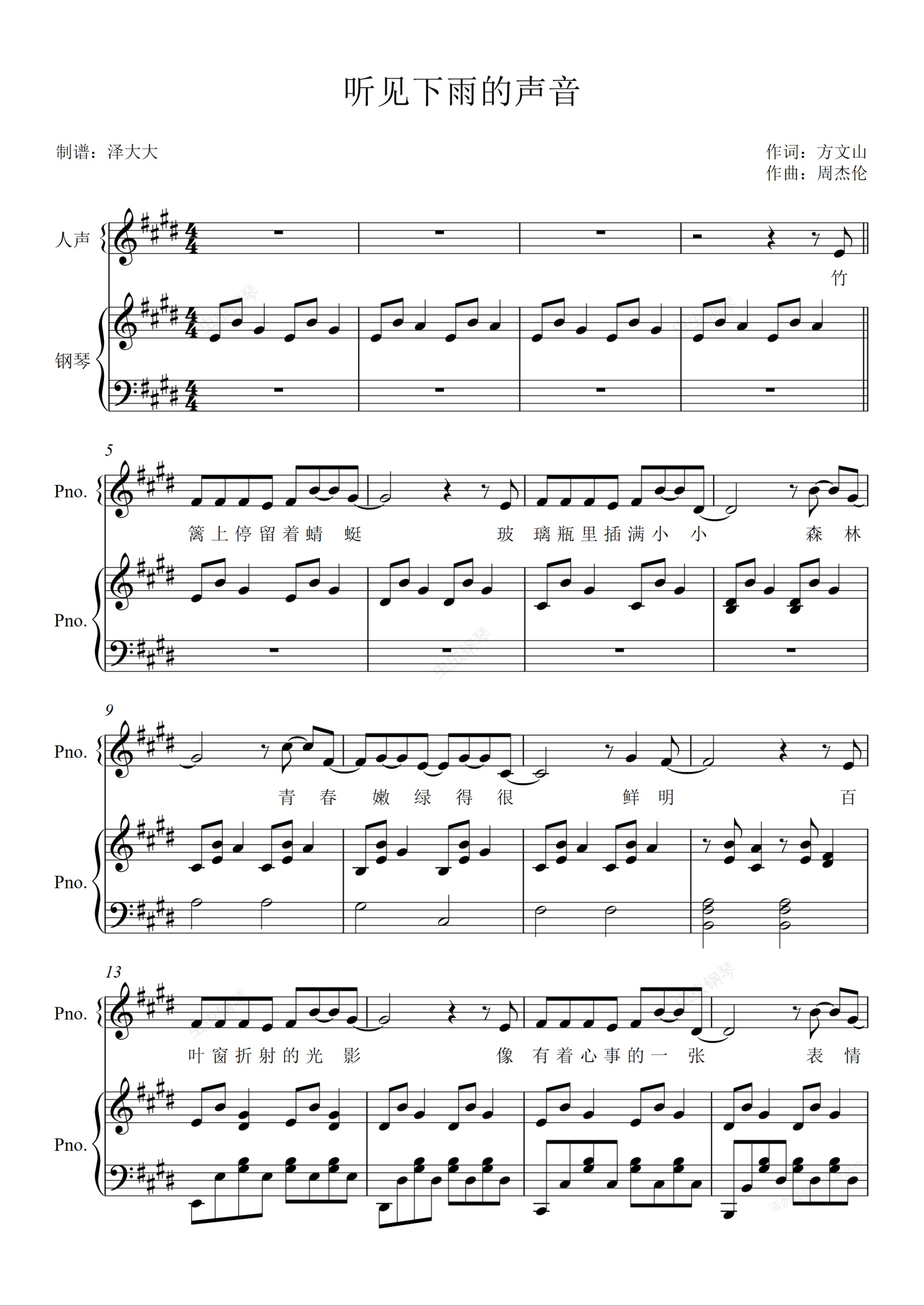 钢琴谱:听见下雨的声音【原版弹唱附词】泽大大 周杰伦