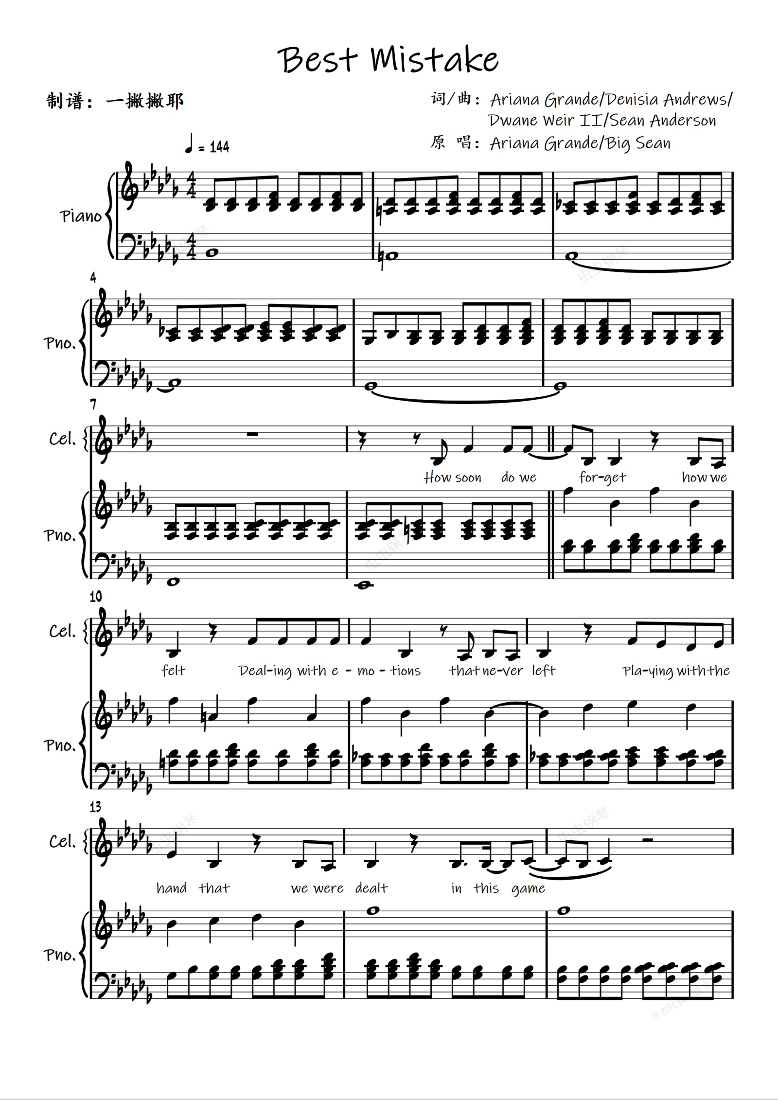 钢琴谱:Best Mistake【伴奏谱】Ariana Grande/Big Sean「一撇撇耶」