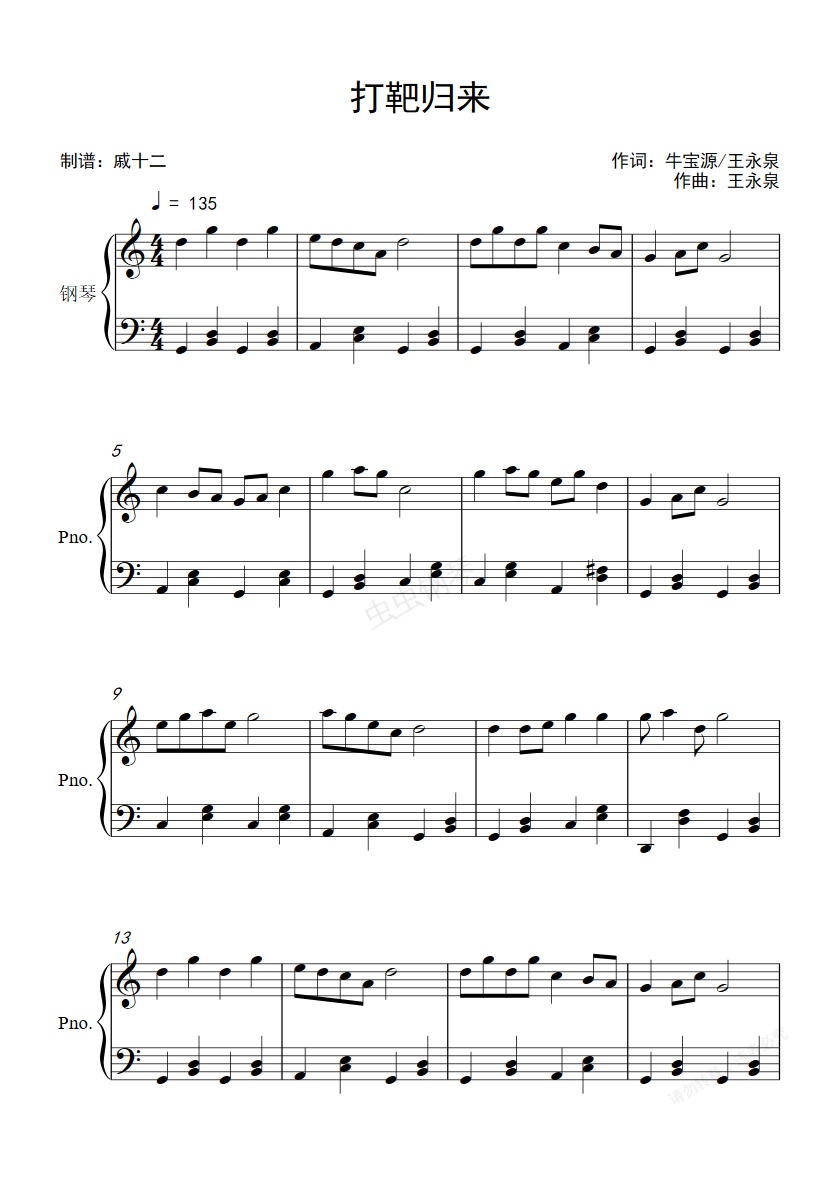 钢琴谱:打靶归来-C调简单版