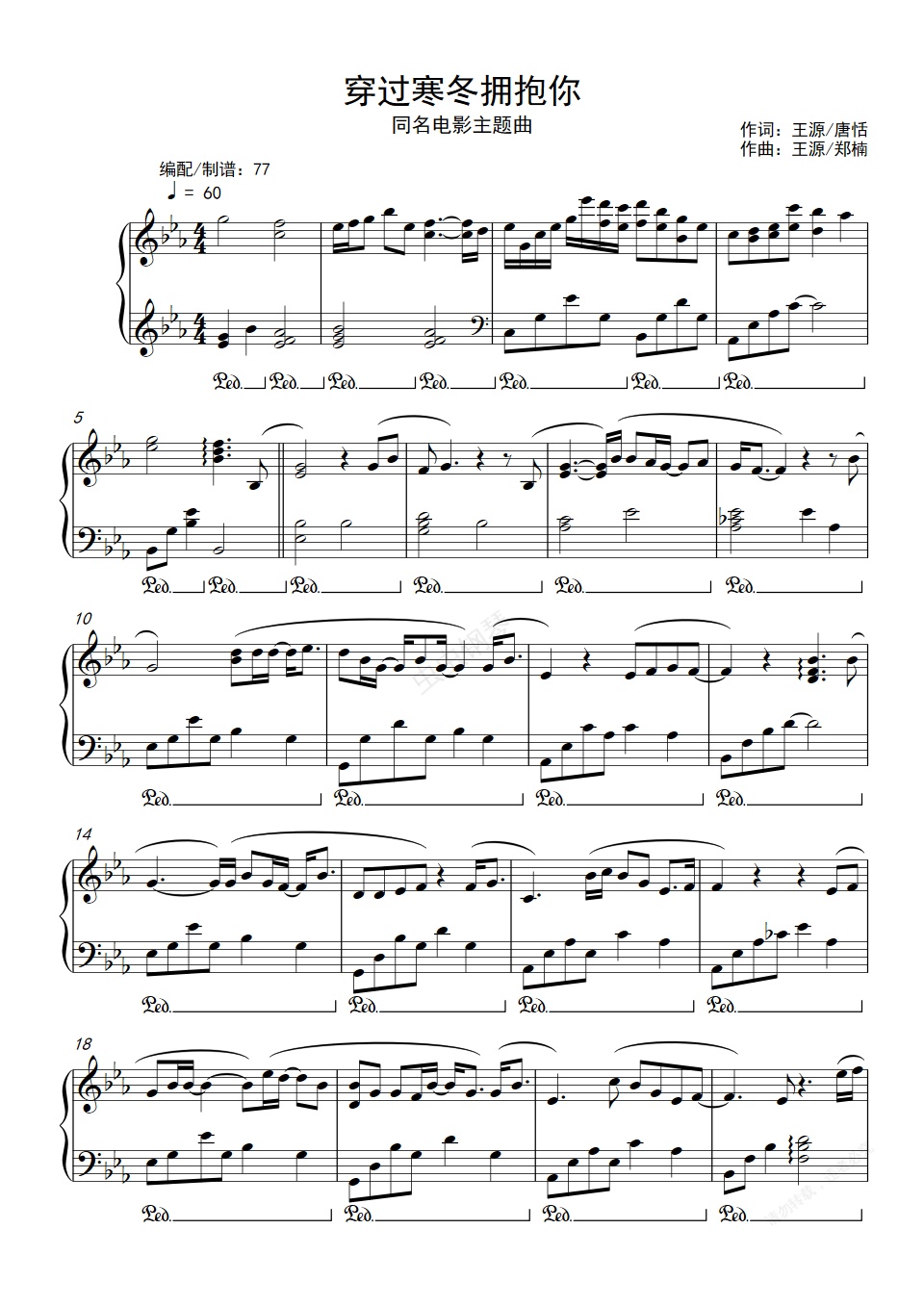 钢琴谱:王源-《穿过寒冬拥抱你》钢琴独奏谱