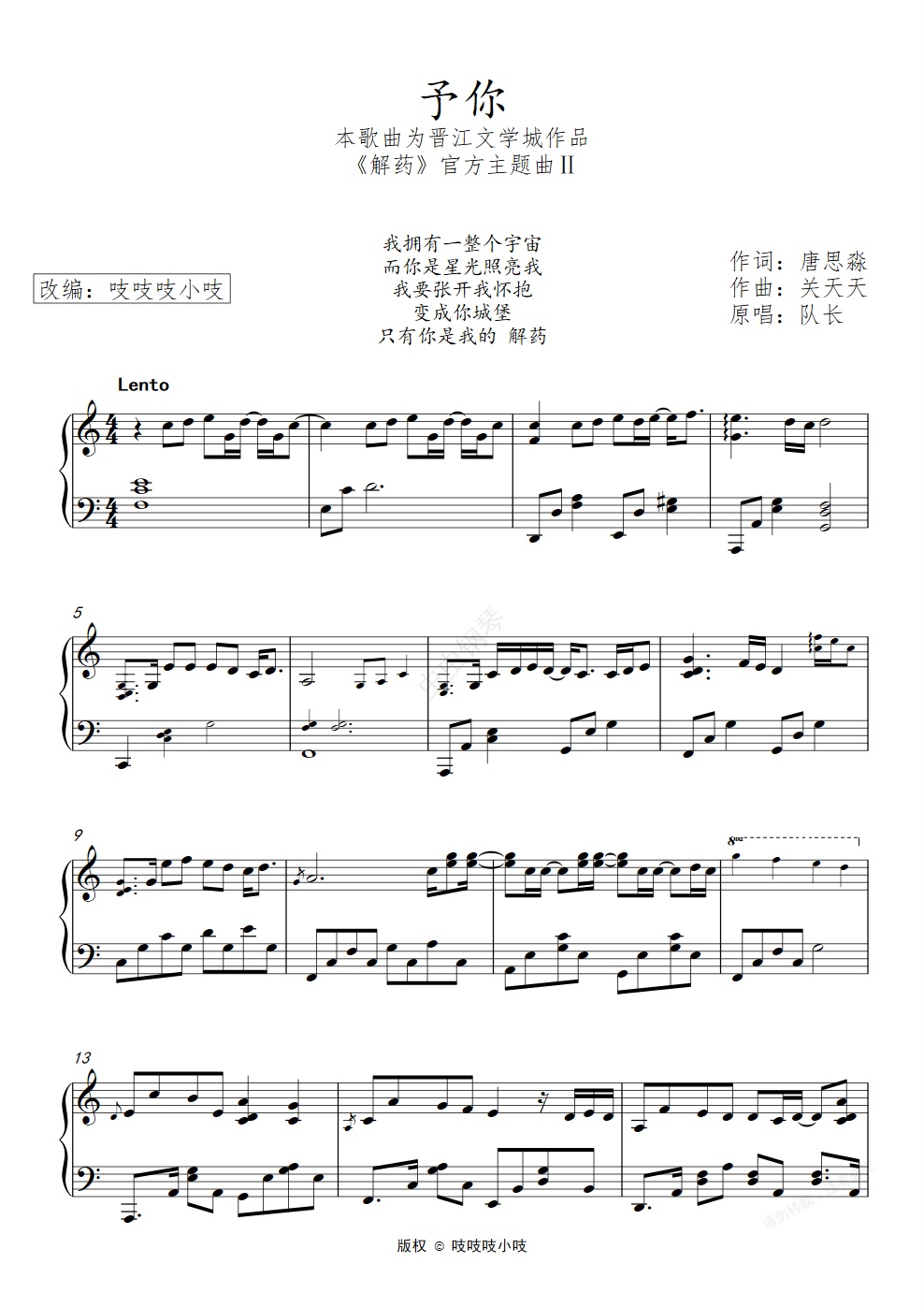 钢琴谱:予你 C调版 《解药》官方主题曲Ⅱ