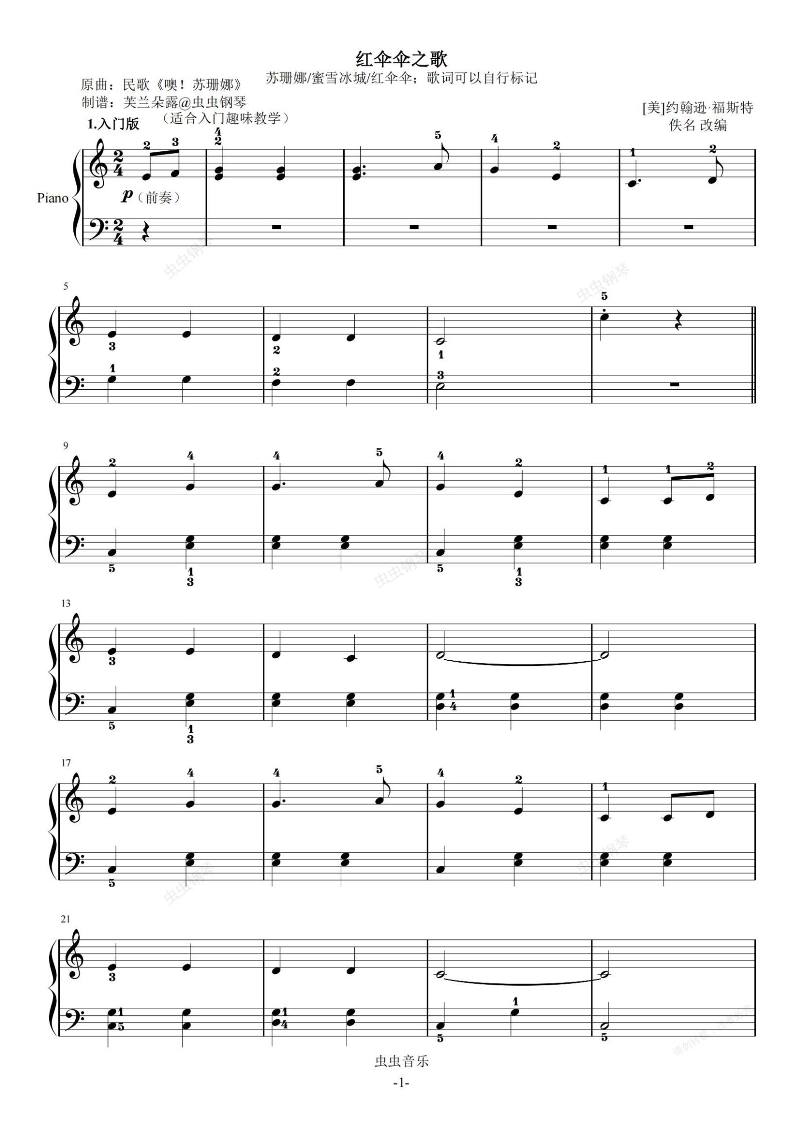 钢琴谱:红伞伞之歌(蜜雪冰城红伞伞版)超简易 带歌词指法