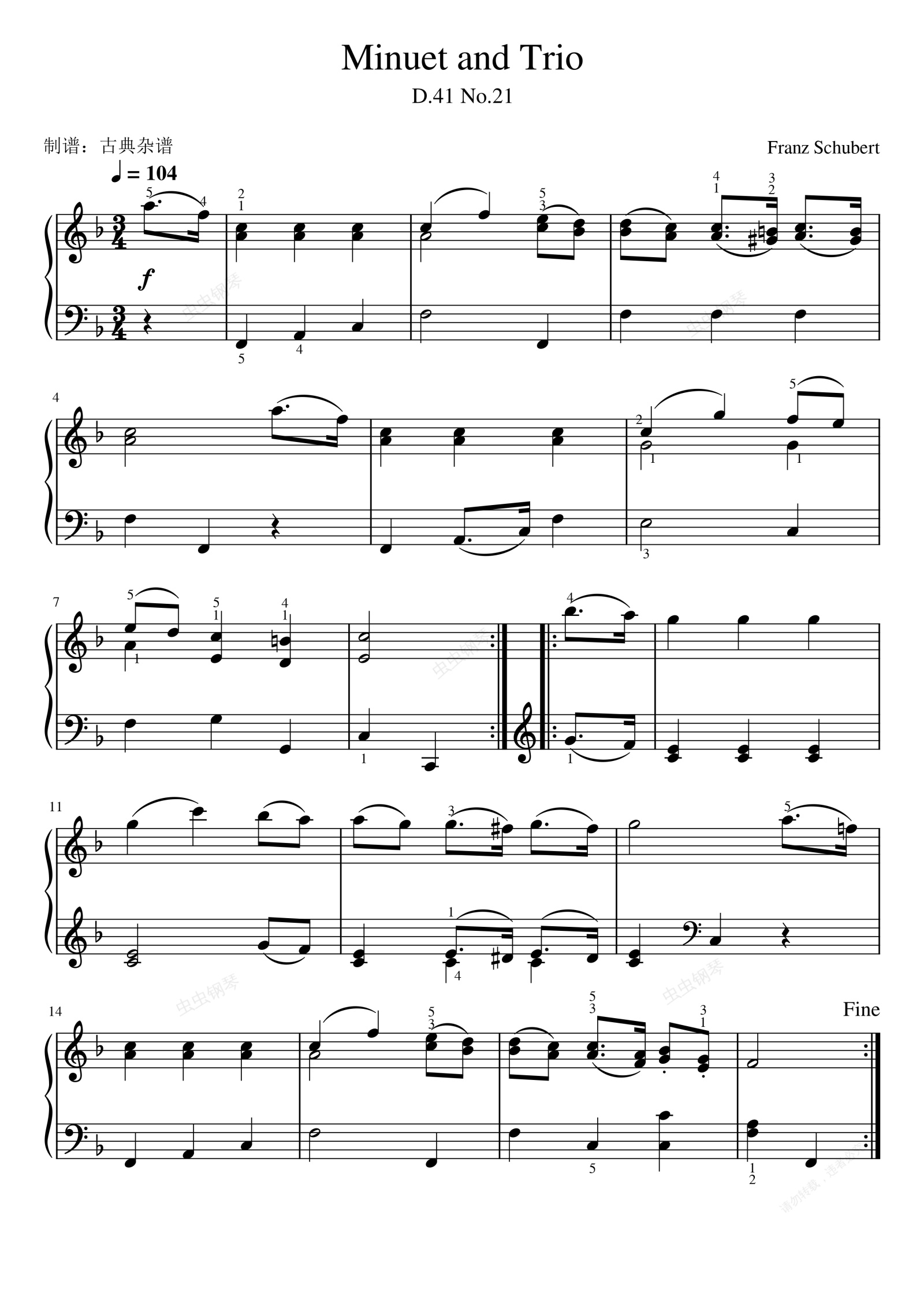 钢琴谱:Minuet and Trio舒伯特,英皇考级2021&20224级曲目(带指法)
