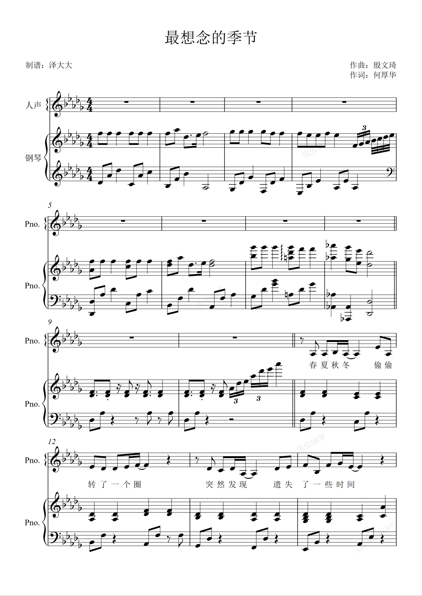 钢琴谱:最想念的季节【原版弹唱附词】圣诞节 泽大大 张含韵