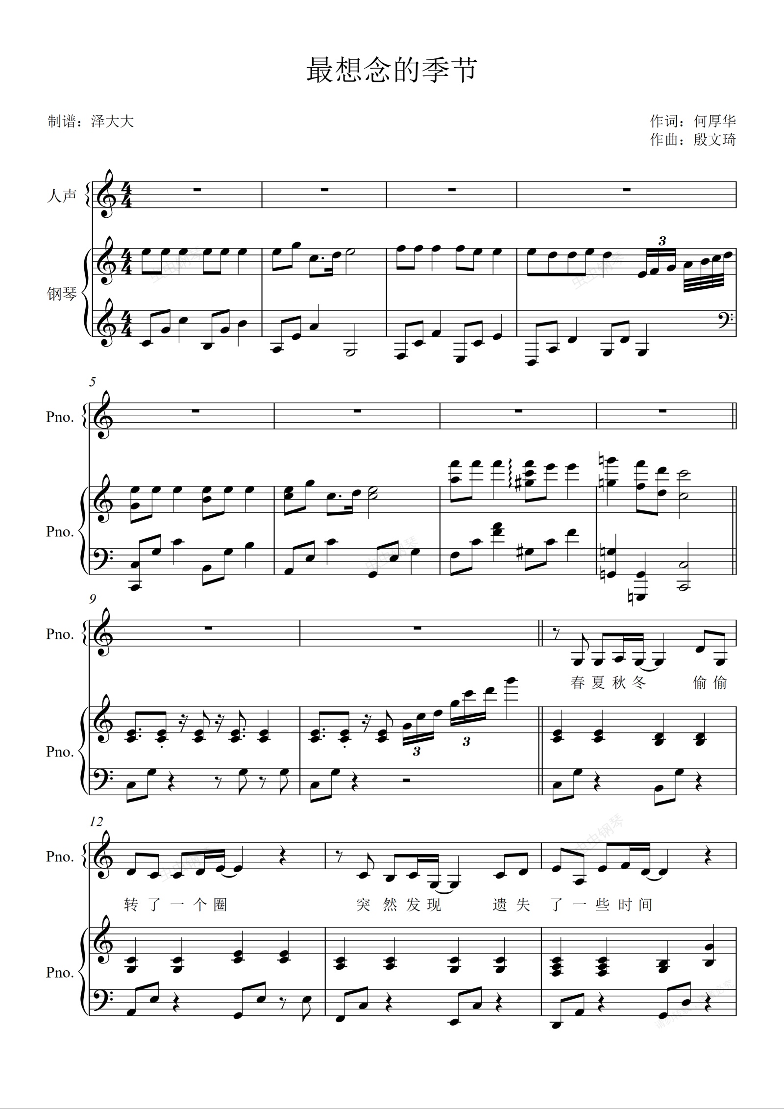 钢琴谱:最想念的季节【C调弹唱附词】圣诞节 泽大大 张含韵