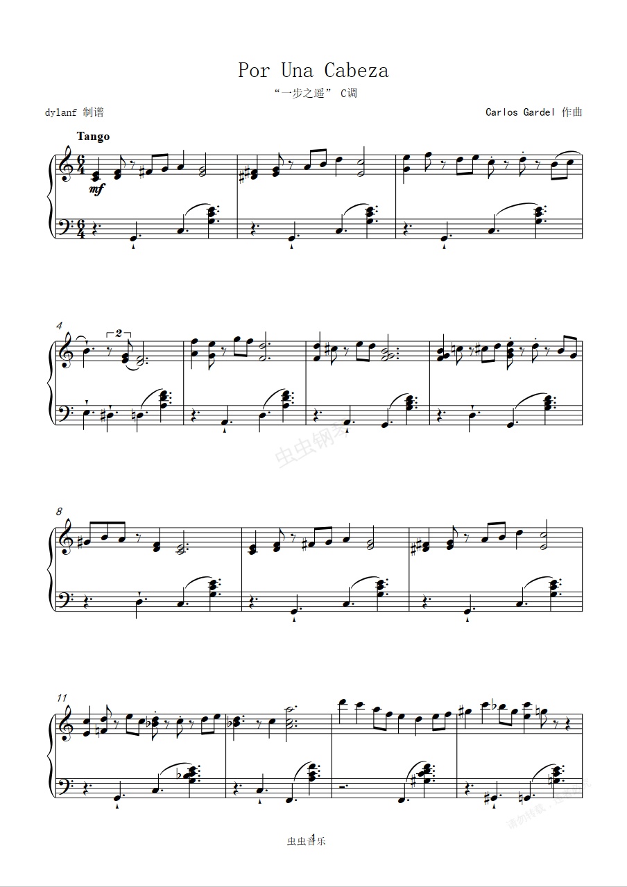 钢琴谱:C调易弹 一步之遥Por Una Cabeza《闻香识女人》Tango探戈舞曲