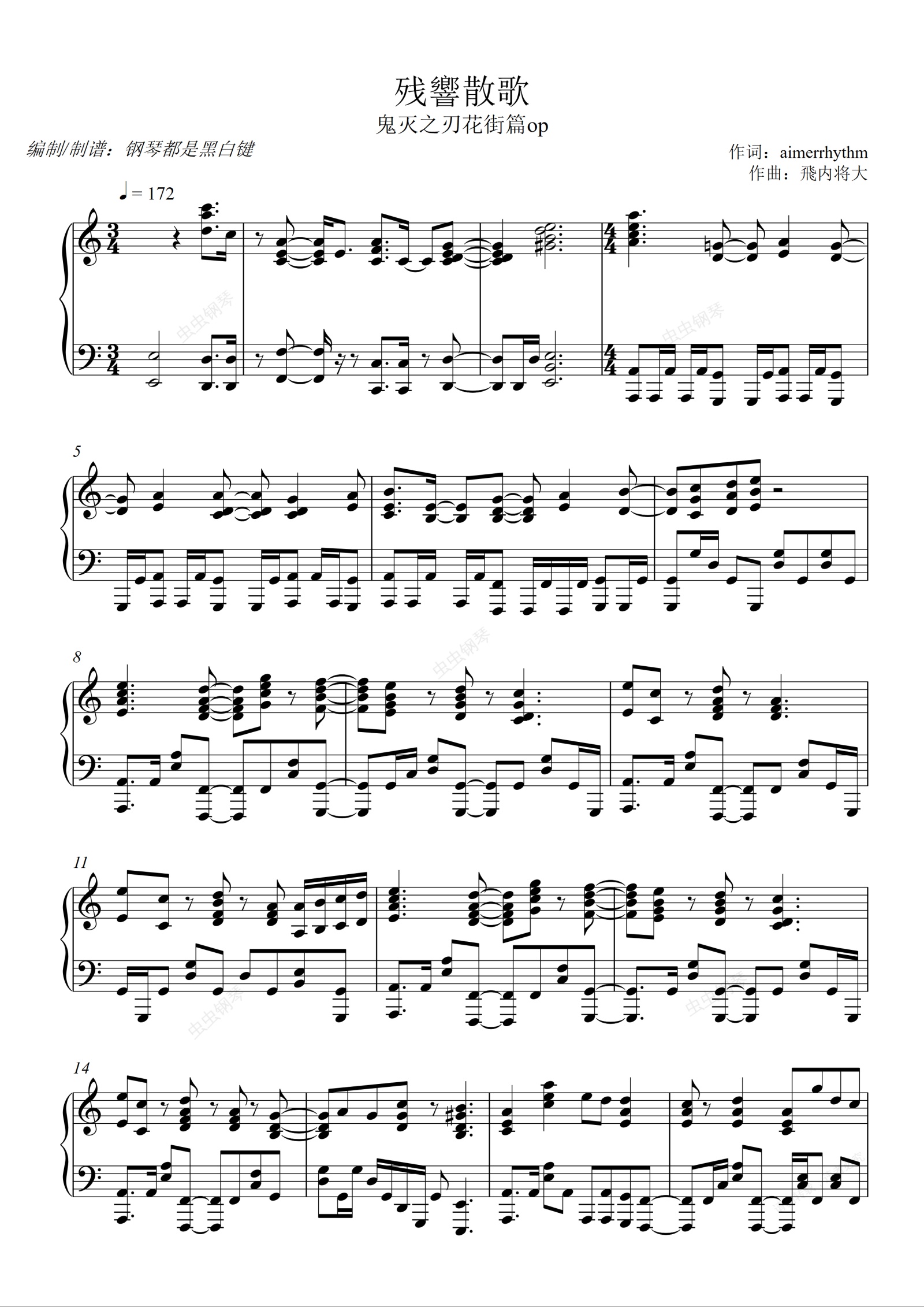 《残響散歌》是TV动画《鬼灭之刃:花街篇》的片头曲,由Aimer演唱,于2021年12月6日公开发布。我的主页还有原调版本,小伙伴可根据喜爱自行选择