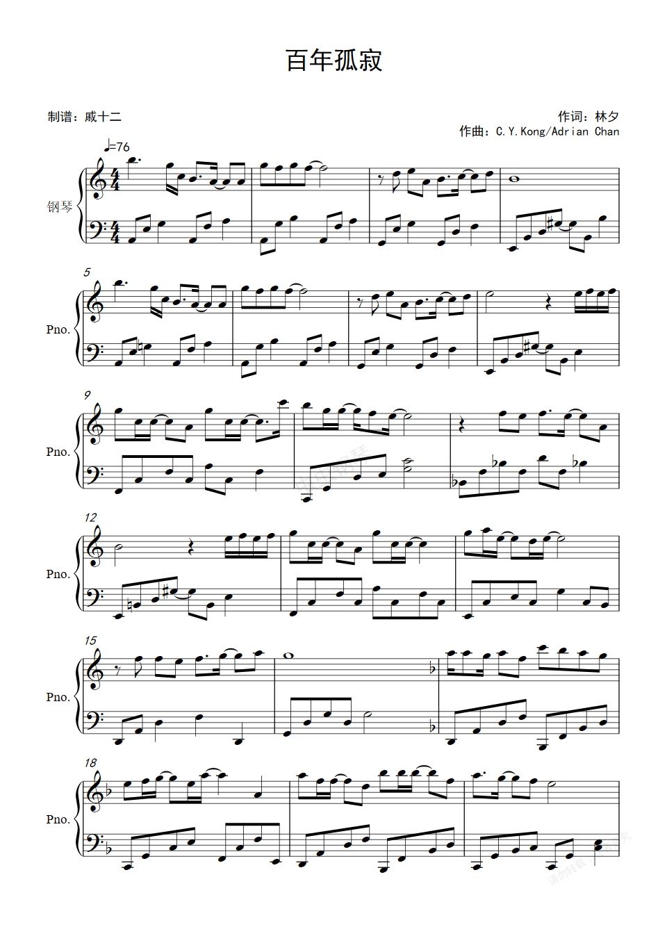 钢琴谱:百年孤寂-C调简单版