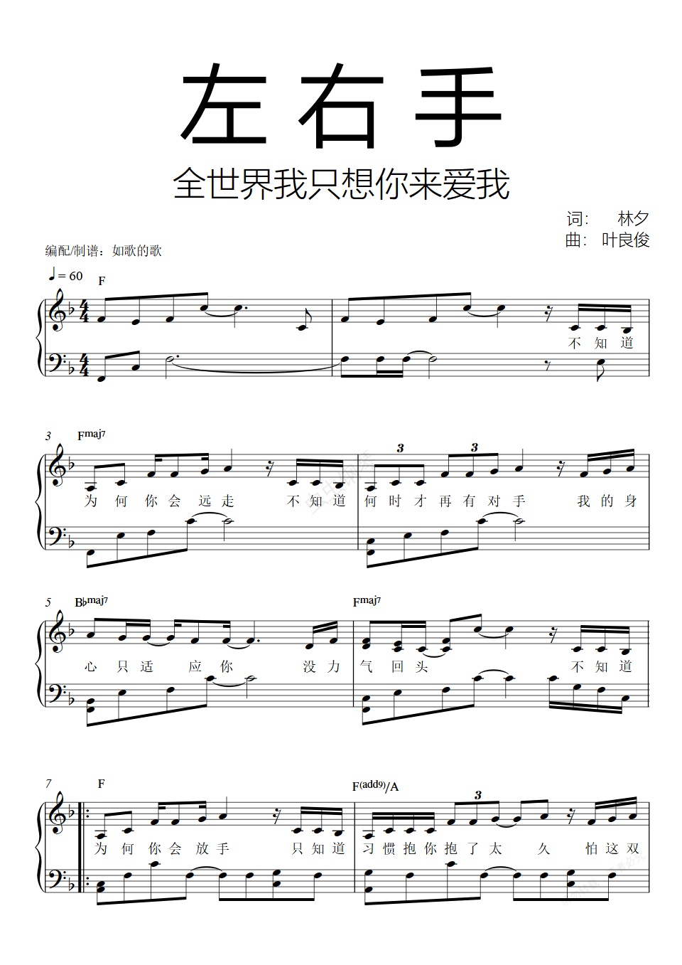 钢琴谱:左右手/全世界我只想你来爱我-原调