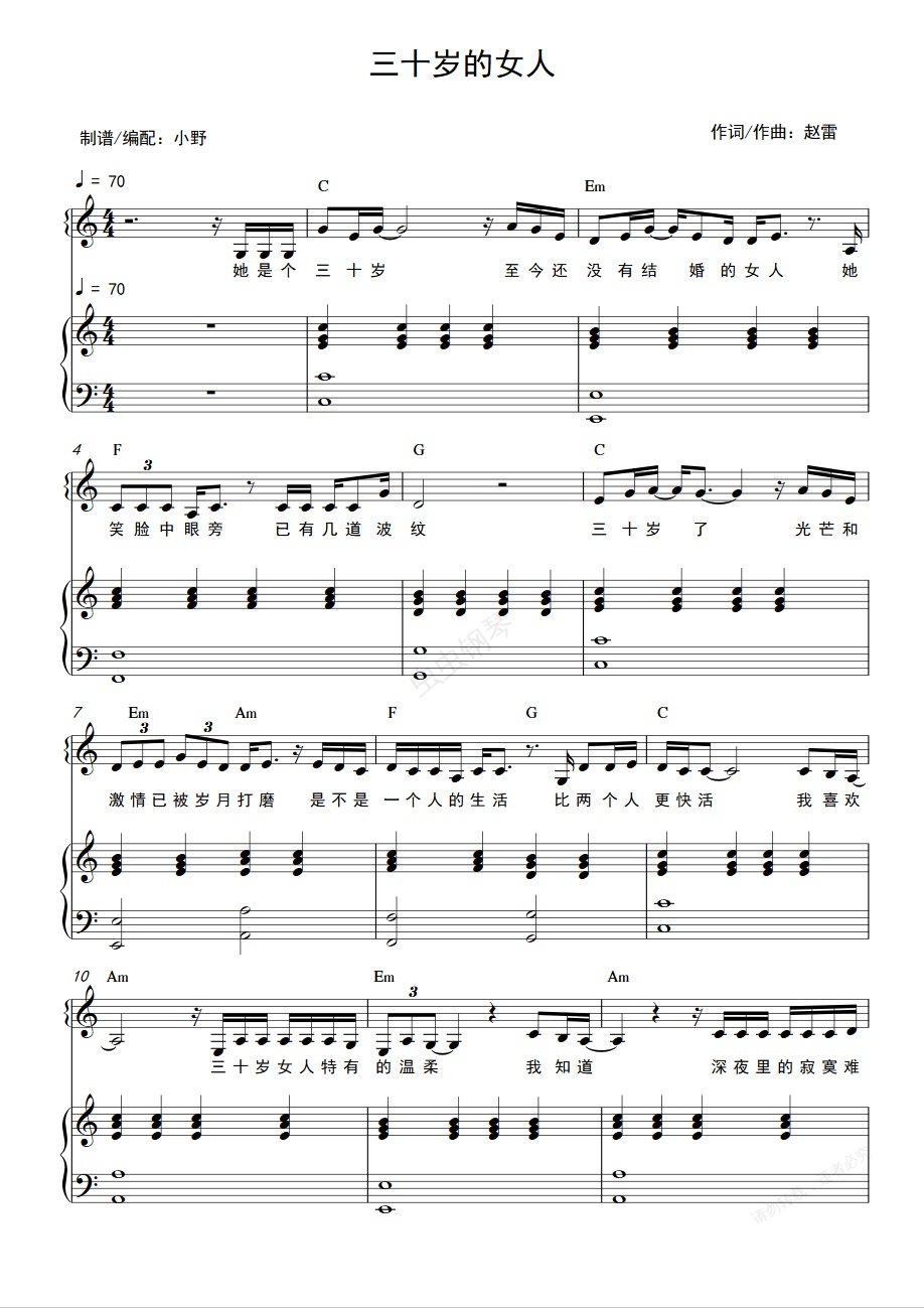 钢琴谱:三十岁的女人(和弦弹唱版)