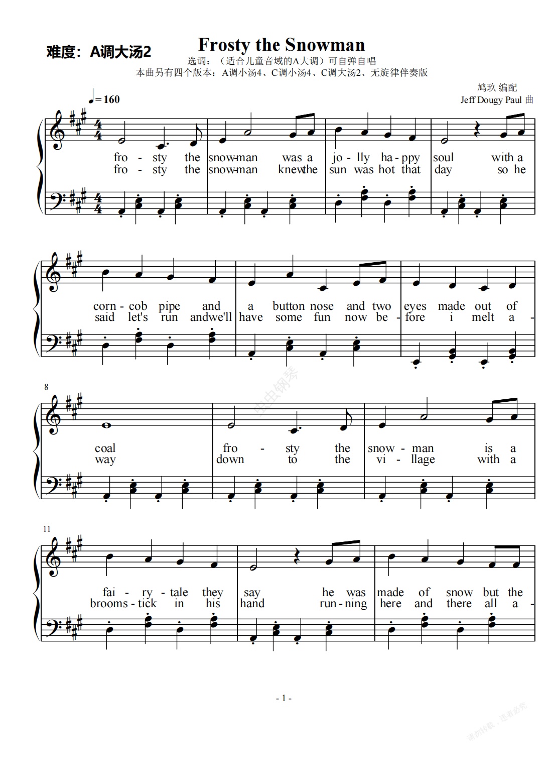 钢琴谱:Frosty the Snowman(A调大汤2版本)圣诞儿歌