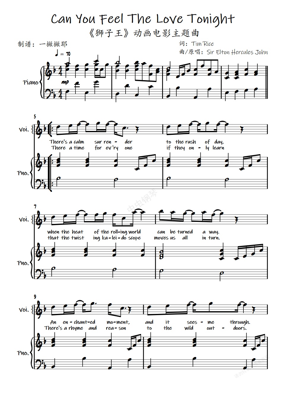 钢琴谱:【女版弹唱】Can You Feel the Love Tonight《狮子王》「一撇撇耶」