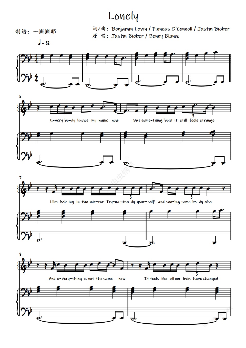 钢琴谱:【女版弹唱】Lonely-Justin Bieber 贾斯汀比伯「一撇撇耶」