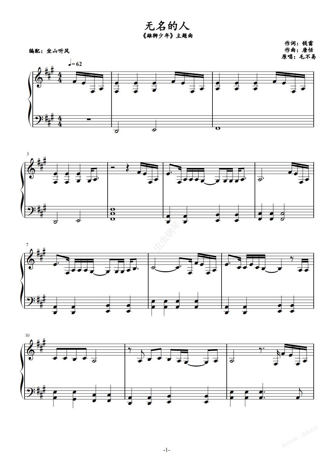 钢琴谱:无名的人——《雄狮少年》主题曲