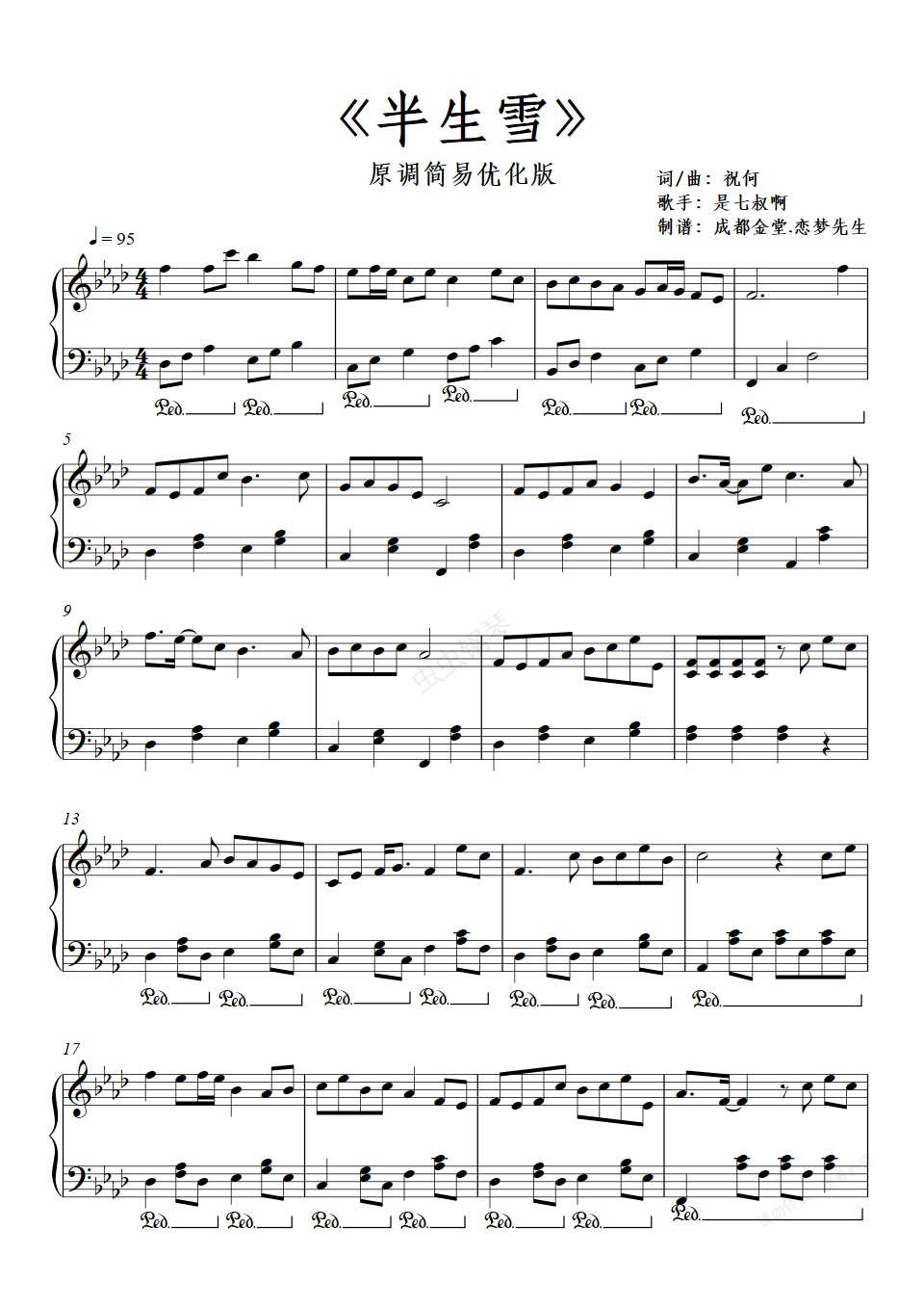 钢琴谱:《半生雪》是七叔啊-原调简易优化版