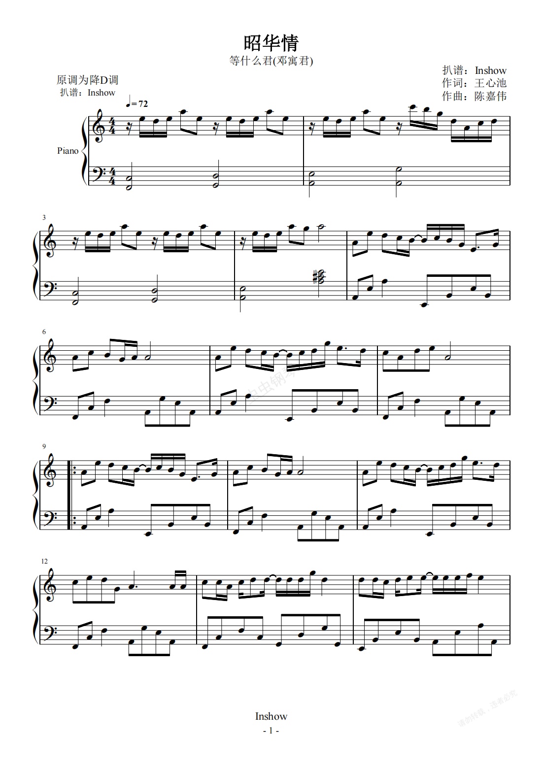 钢琴谱:昭华情【C调独奏】- 等什么君(邓寓君) -