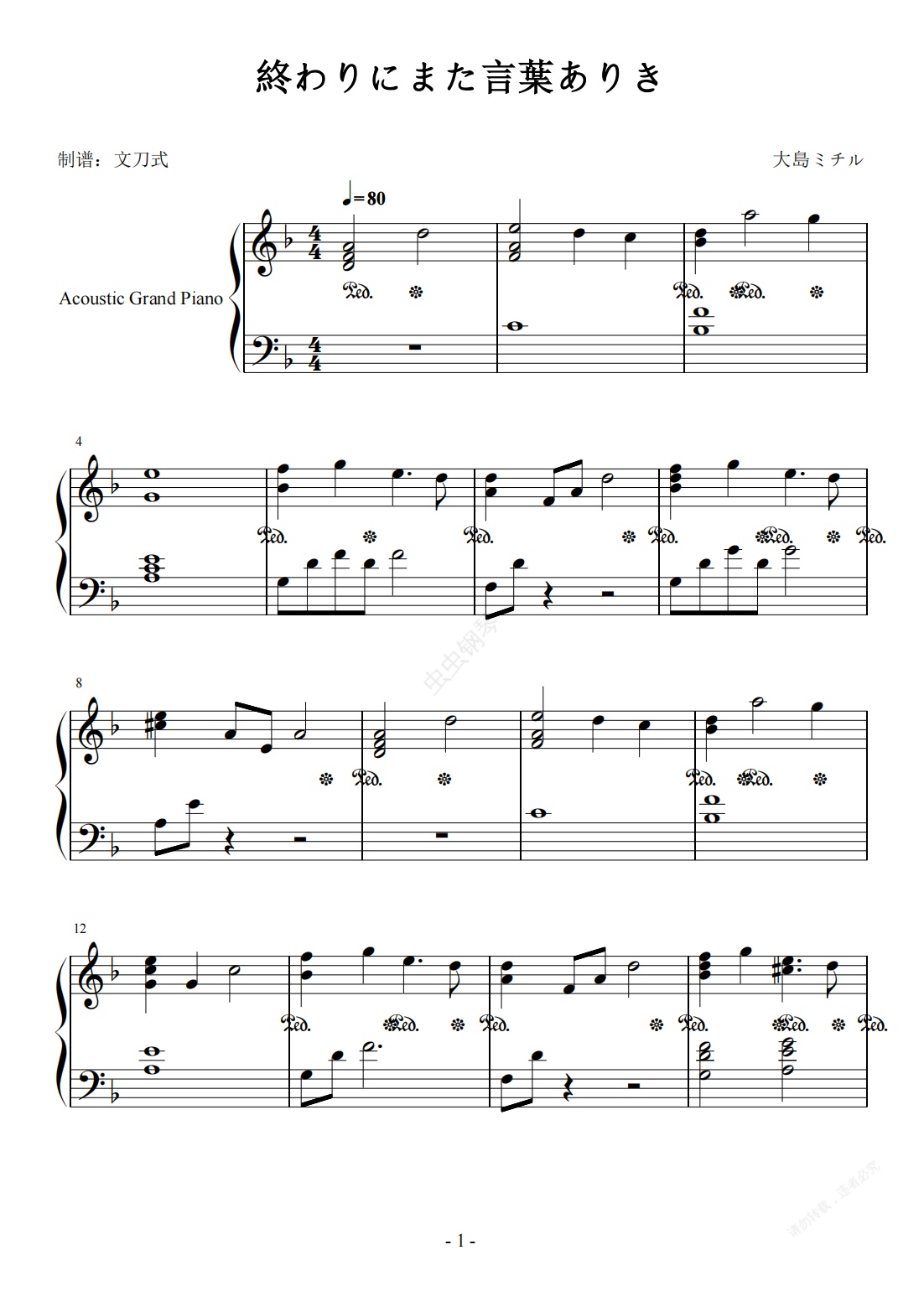 钢琴谱:女装骑士《終わりにまた言葉ありき》OST