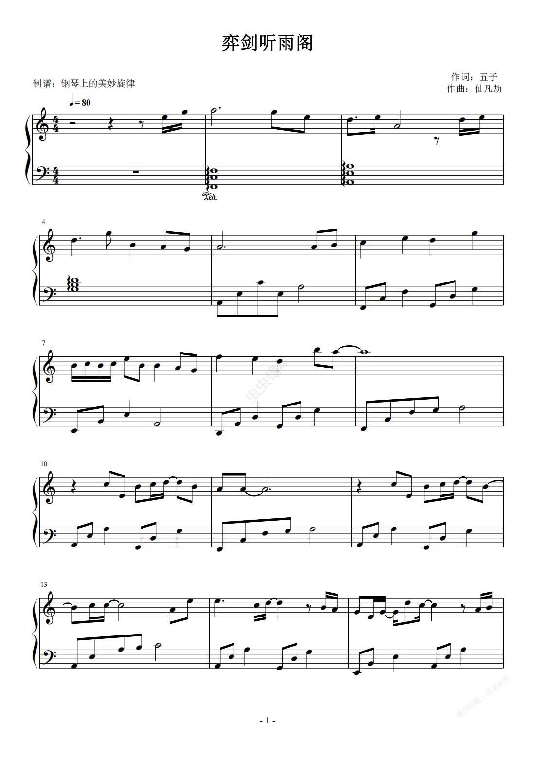 钢琴谱:弈剑听雨阁 C调简易版 小曲儿