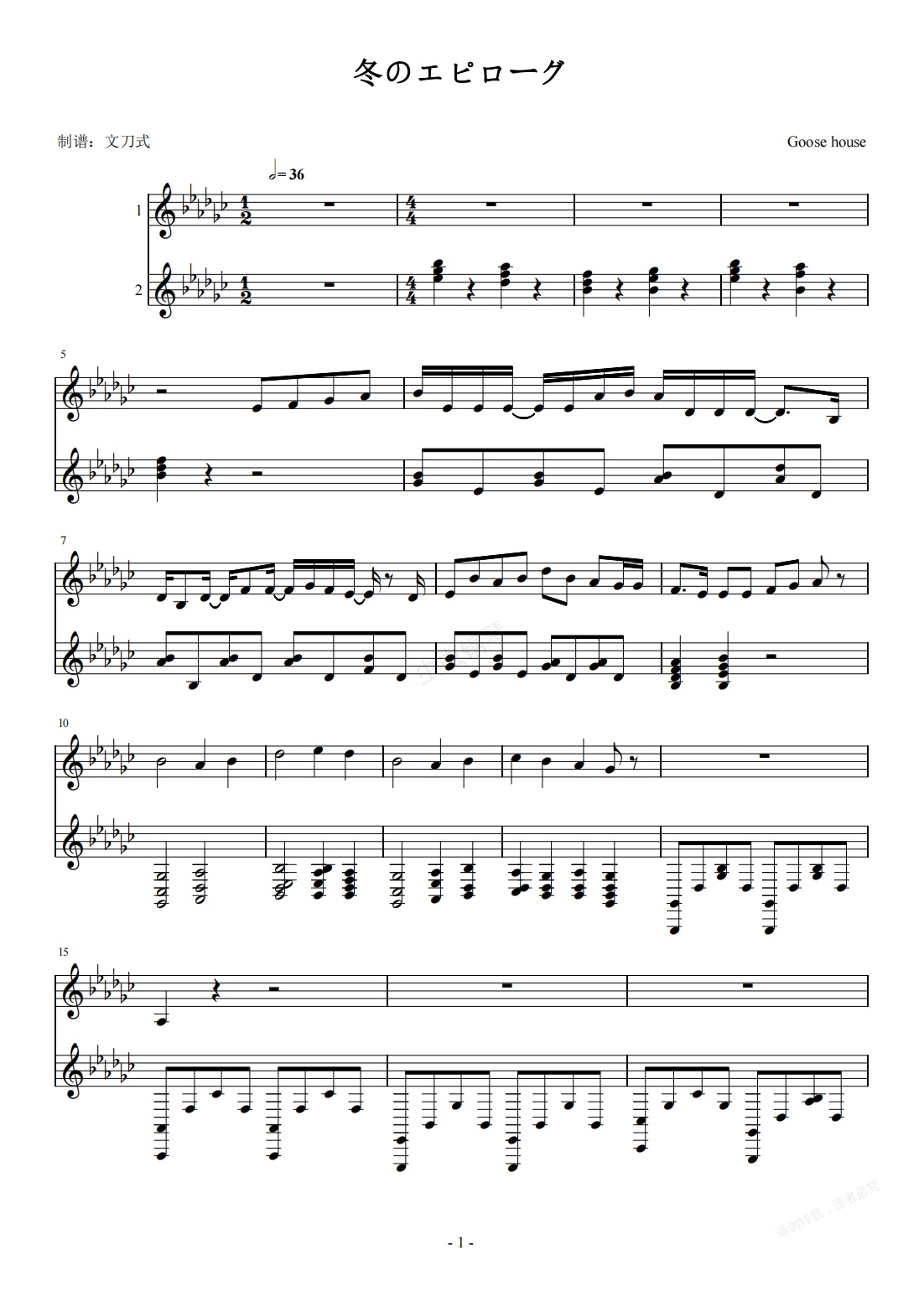 钢琴谱:四月是你的谎言《冬のエピローグ》OST