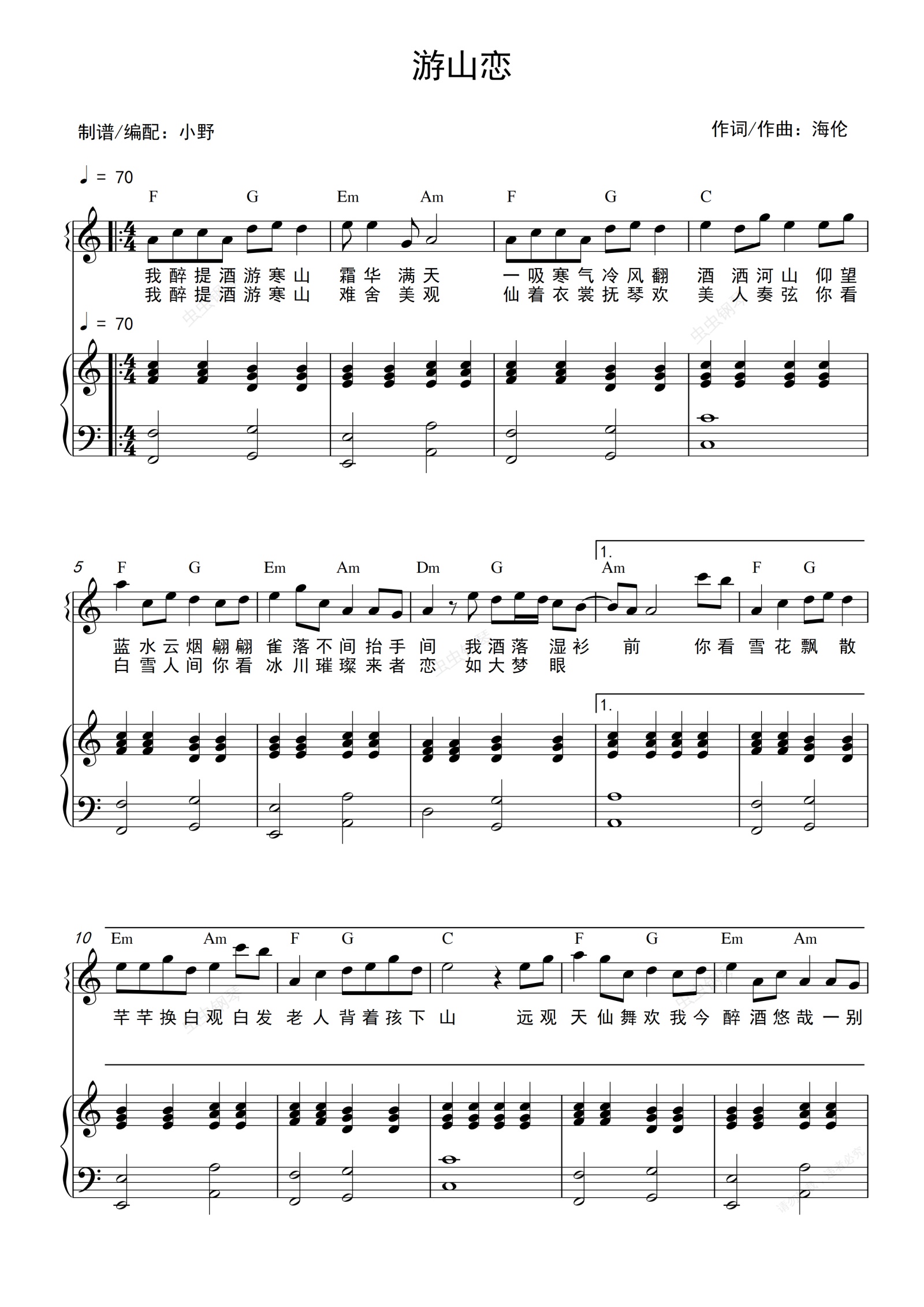 钢琴谱:游山恋(和弦弹唱版)