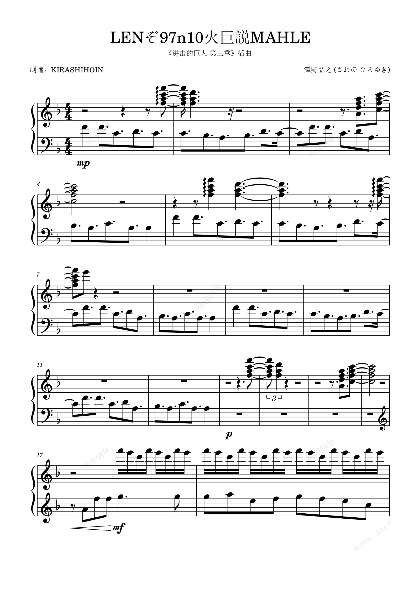 钢琴谱:LENぞ97n10火巨説MAHLE(《进击的巨人 第三季》插曲)- 泽野弘之