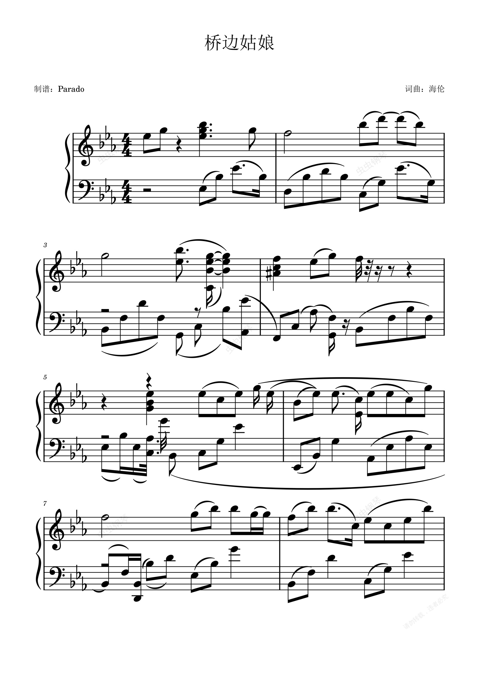 钢琴谱:桥边姑娘-海伦-抖音热曲-好听又好弹
