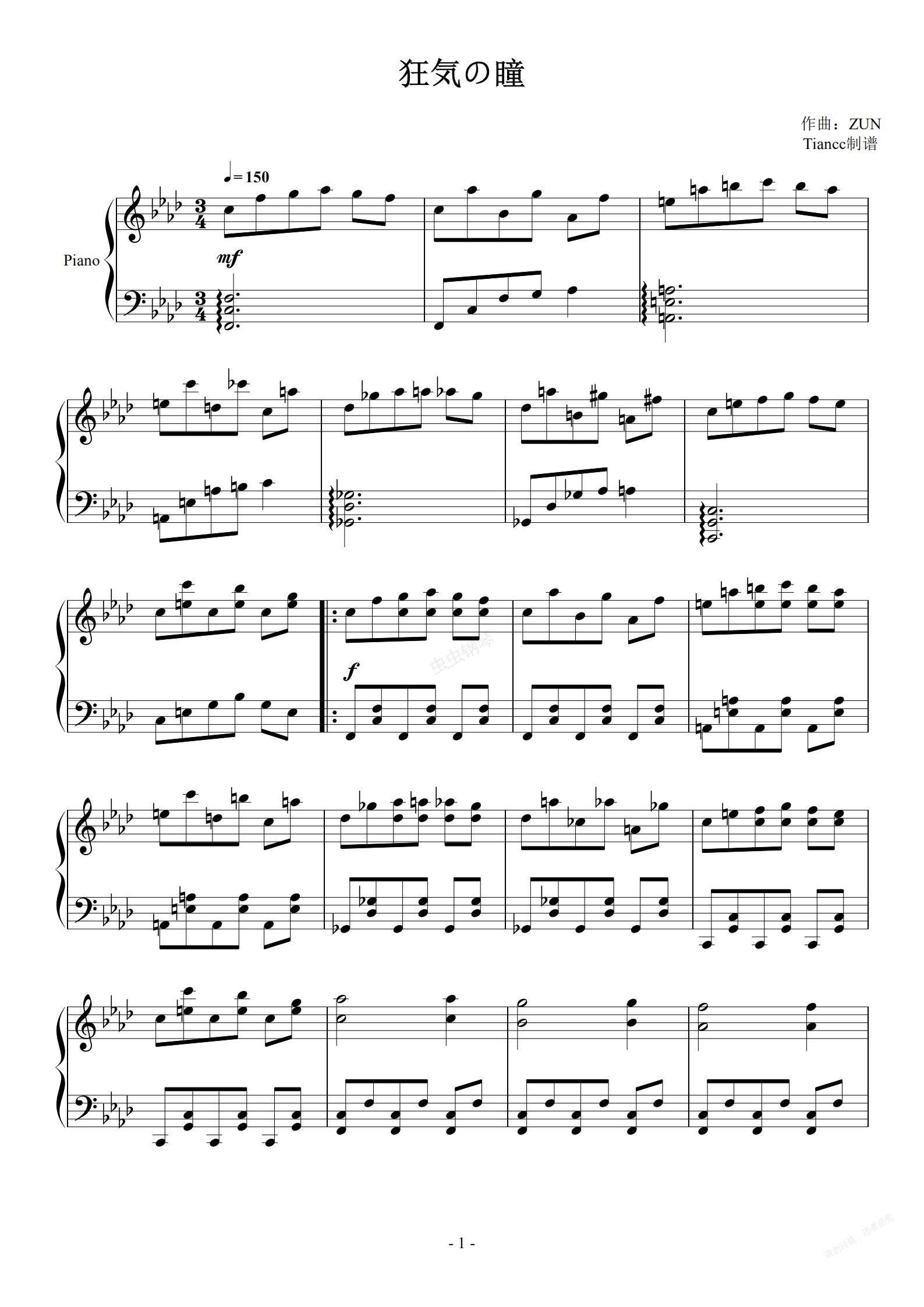 钢琴谱:东方project《狂气之瞳》,此生无悔入东方,299难度