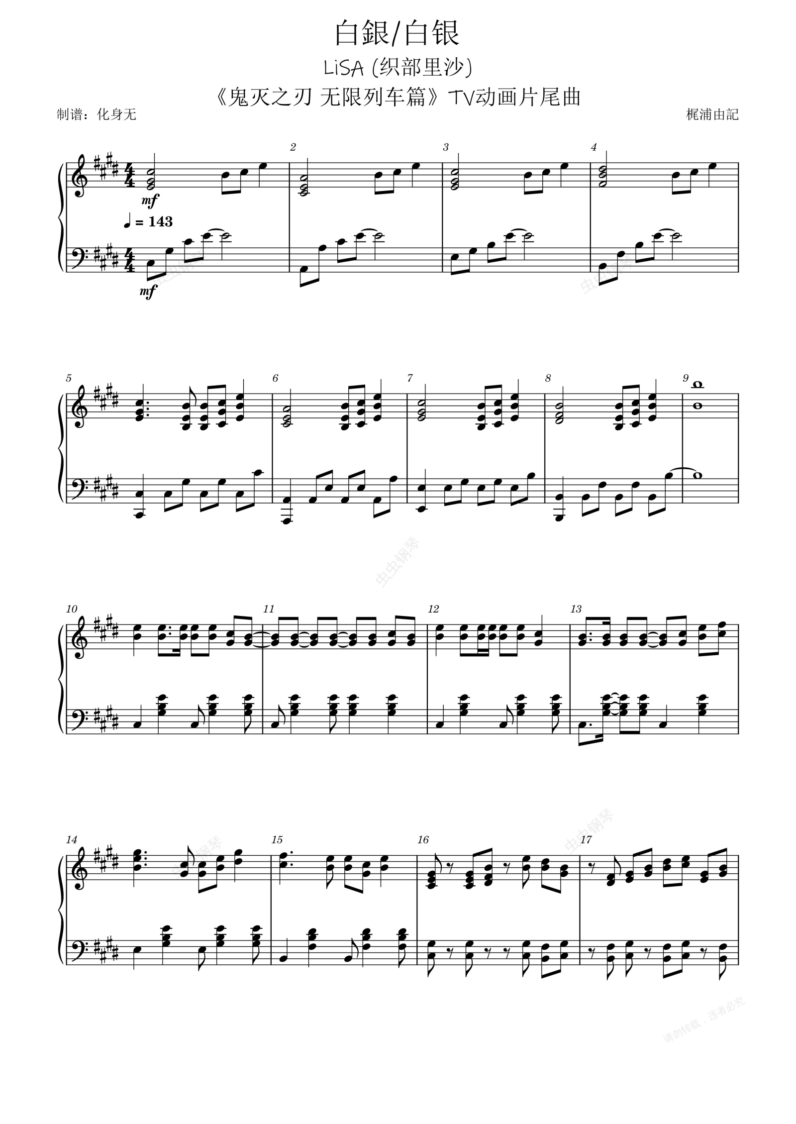 钢琴谱:白银 《鬼灭之刃 无限列车篇》TV动画片尾曲 LiSA (织部里沙)