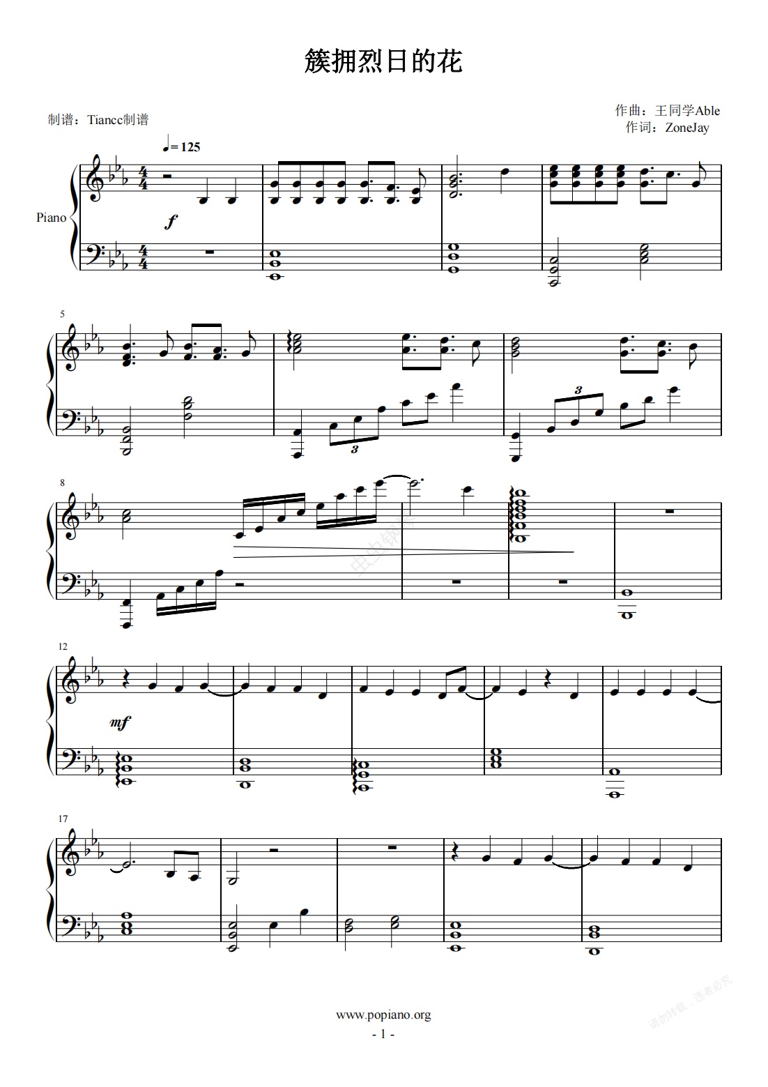 钢琴谱:《簇拥烈日的花》迟里乌布,849难度