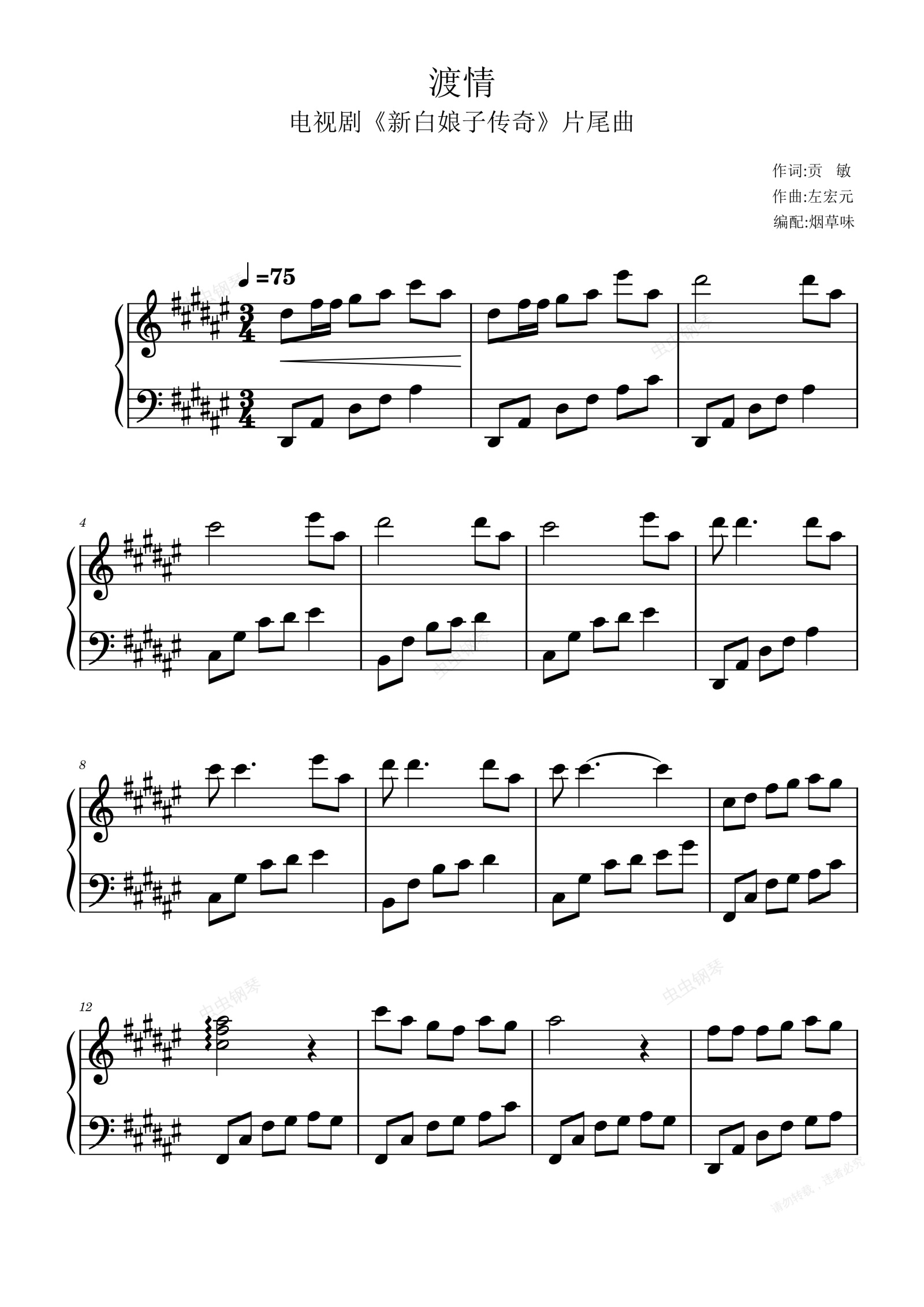 钢琴谱:渡情-黑键弹奏(简单唯美)根据《悠悠琴韵》弹奏改编