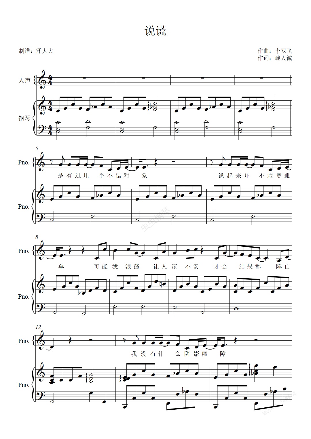 钢琴谱:说谎【C调女生弹唱附词】泽大大 林宥嘉