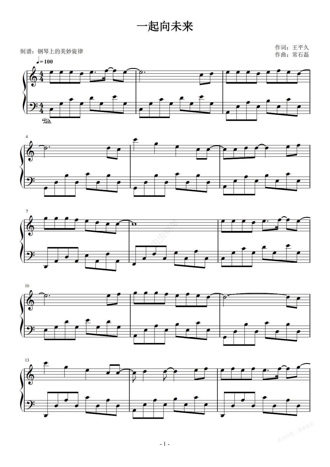 钢琴谱:一起向未来 C调简易版 易烊千玺