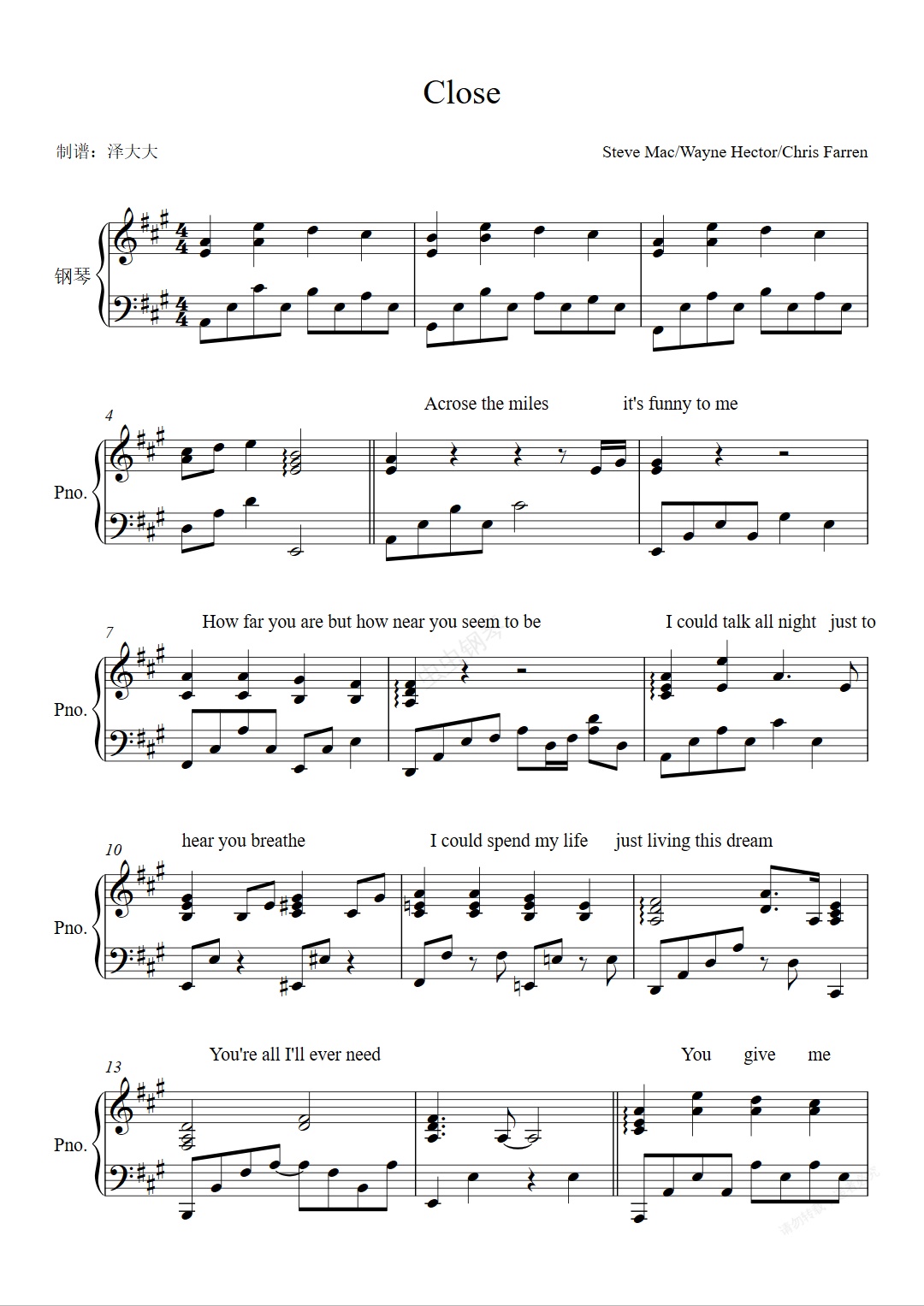 钢琴谱:Close【原版弹唱附词】泽大大 Westlife