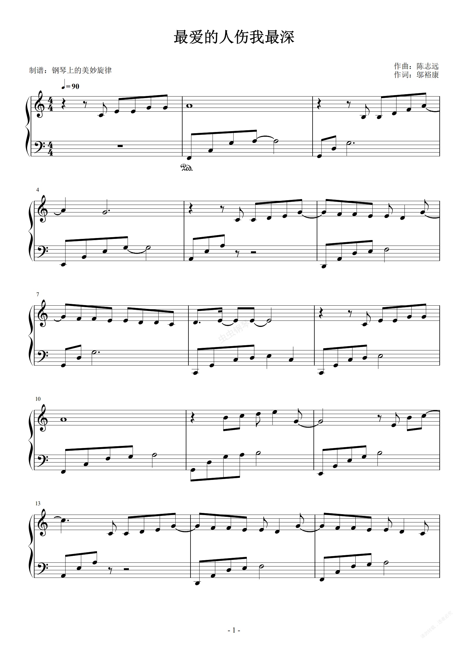 钢琴谱:最爱的人伤我最深 C调简易版 张雨生、张惠妹