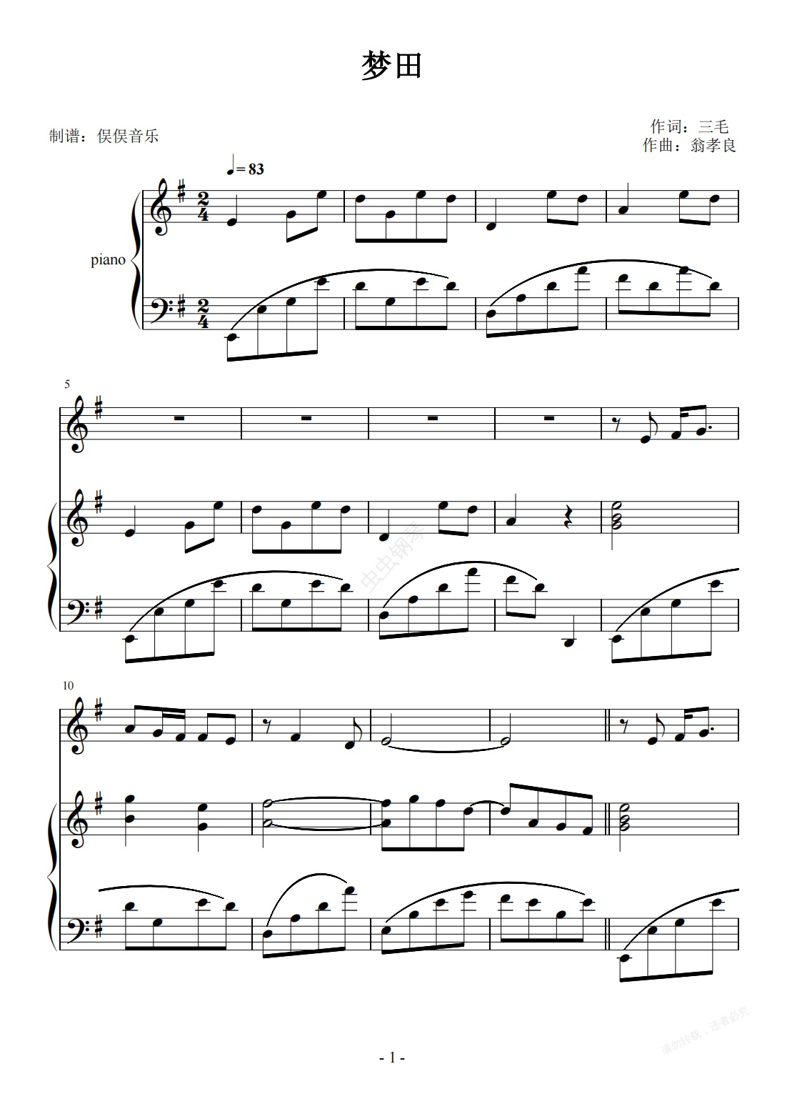 钢琴谱:梦田(三声部合唱伴奏谱)