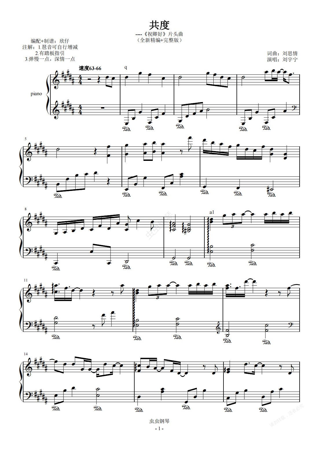 钢琴谱:刘宇宁-B《共度》(《祝卿好》片头曲、全新精编+完整版)