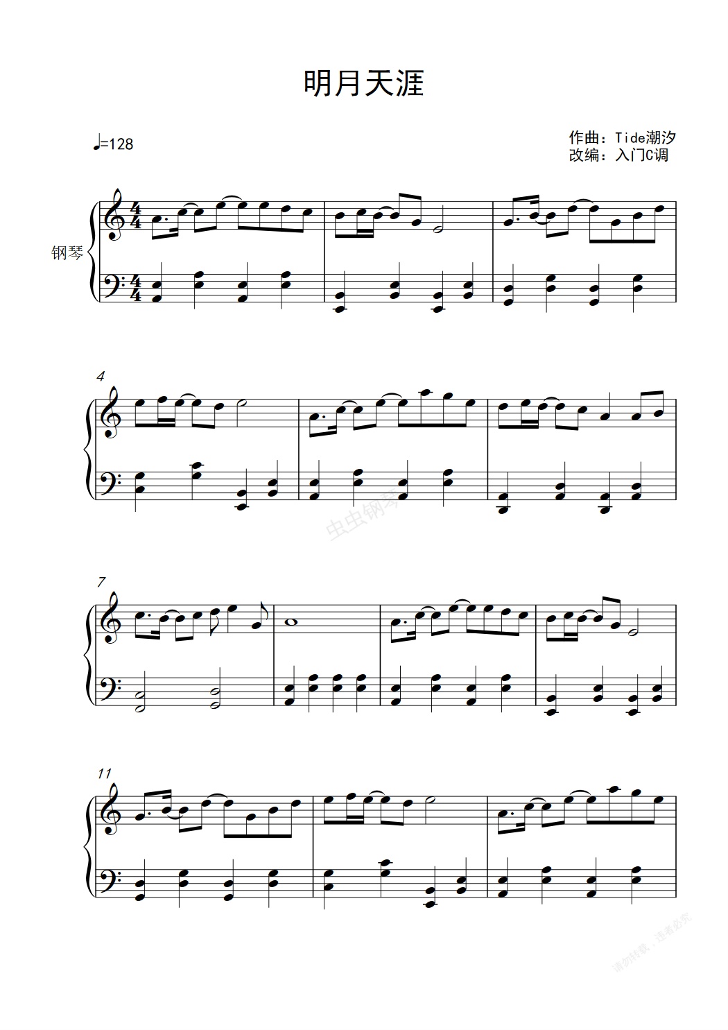钢琴谱:五音Jw《明月天涯》入门C调简单版
