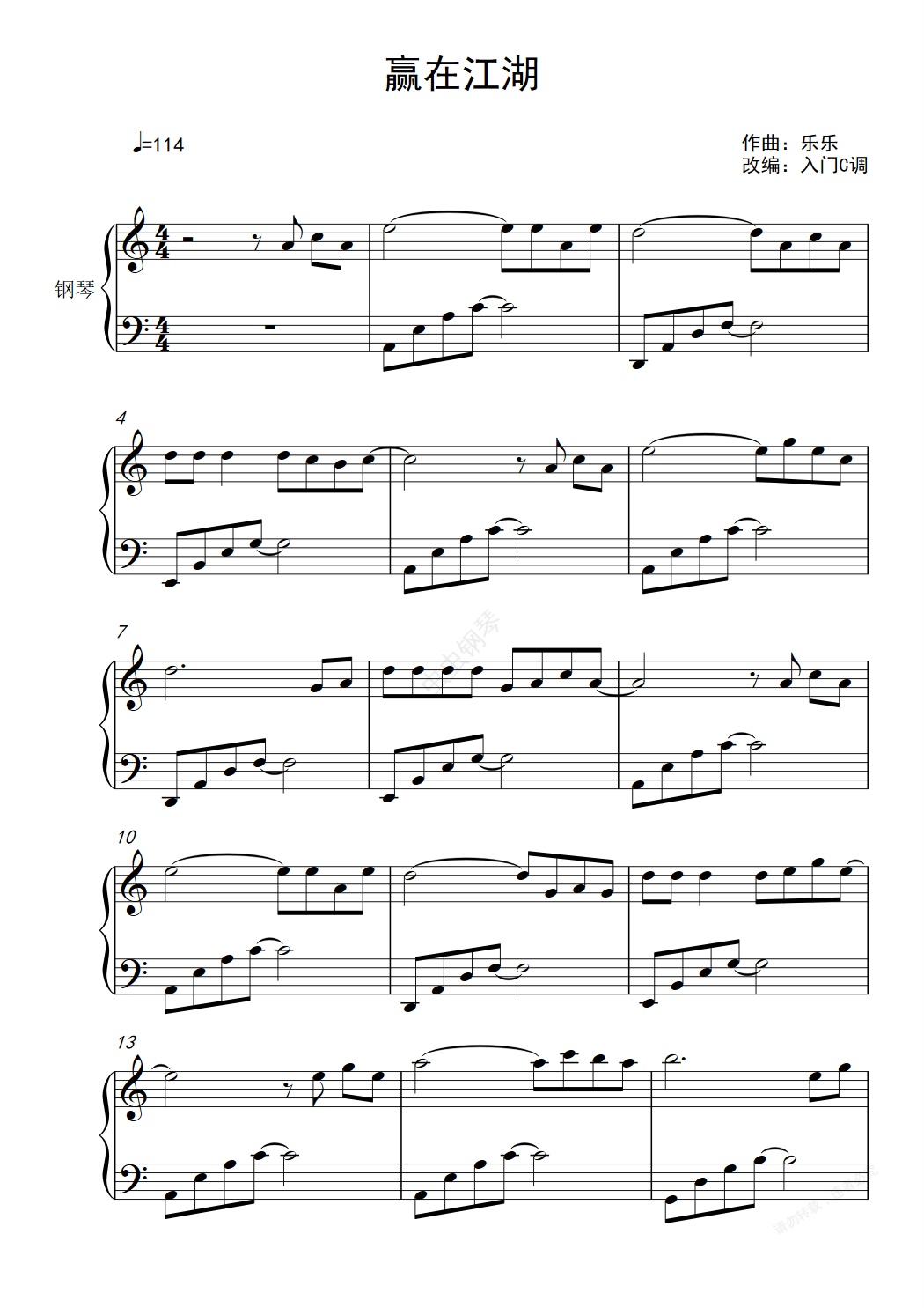 钢琴谱:姜鹏《赢在江湖》入门C调简单版