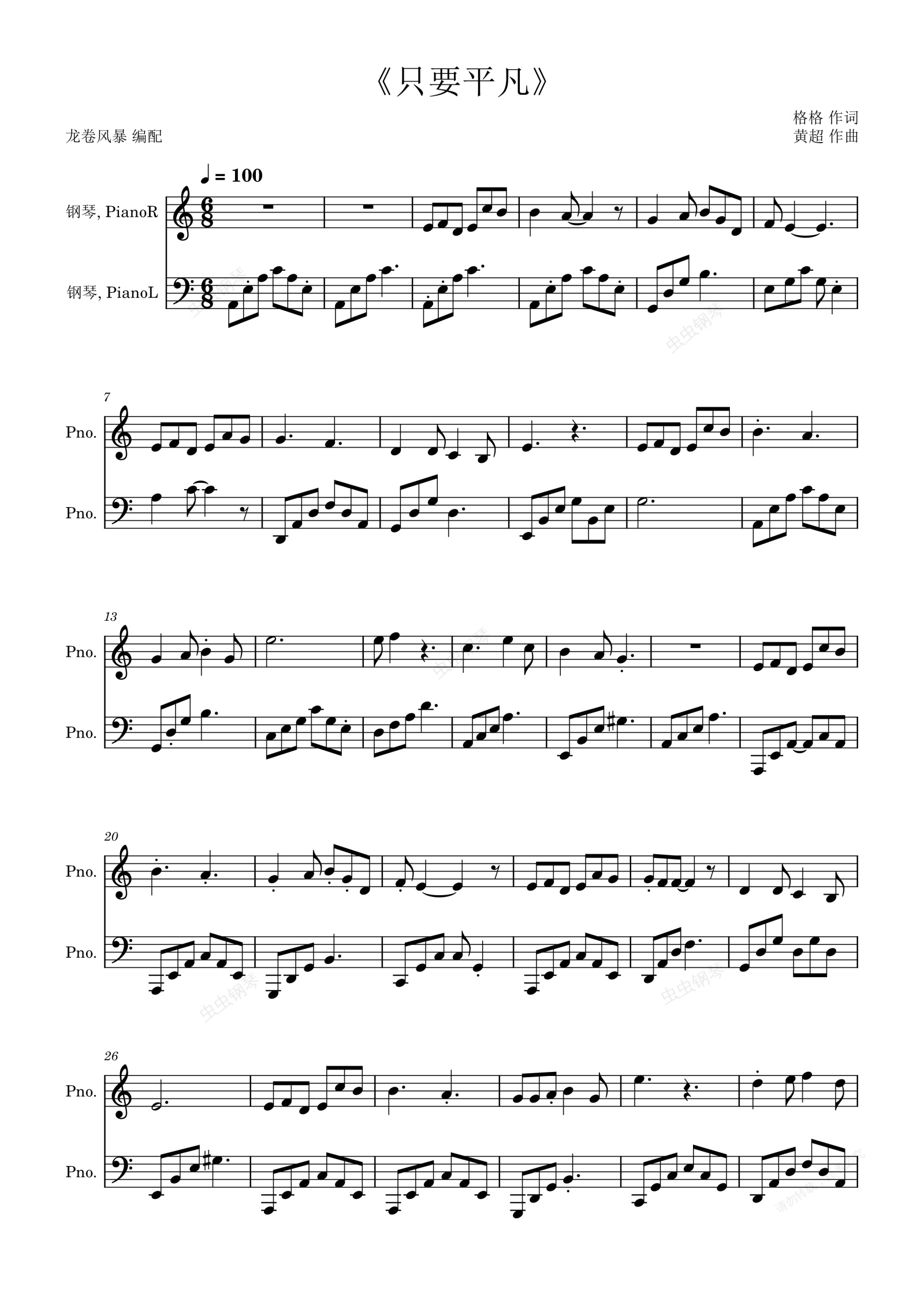 钢琴谱:《只要平凡》张杰/张碧晨(C调简约完美版)